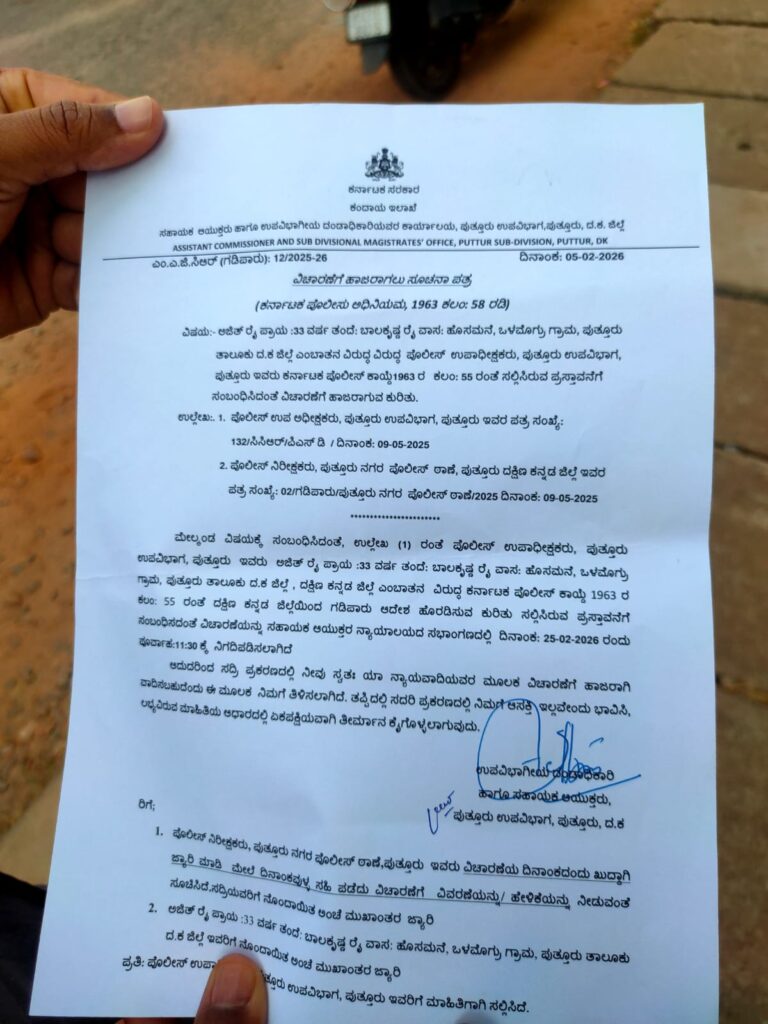ಪುತ್ತೂರು ತಾಲೂಕು ಒಳಮೊಗ್ರು ಗ್ರಾಮ ಹೊಸಮನೆ ನಿವಾಸಿ ಅಜಿತ್ ರೈ ವಿರುದ್ಧ ಪುತ್ತೂರು ಉಪವಿಭಾಗದ ಪೊಲೀಸ್ ಉಪಾಧೀಕ್ಷಕರು ಕರ್ನಾಟಕ ಪೊಲೀಸ್ ಕಾಯ್ದೆ 1963ರ ಕಲಂ 55ರಂತೆ ದಕ್ಷಿಣ ಕನ್ನಡ ಜಿಲ್ಲೆಯಿಂದ ಗಡಿಪಾರು ಆದೇಶ ಹೊರಡಿಸುವ ಕುರಿತು ಸಲ್ಲಿಸಿರುವ ಪ್ರಸ್ತಾವನೆಗೆ ಸಂಬಂಧಿಸಿದಂತೆ ವಿಚಾರಣೆ ಸಹಾಯಕ ಆಯುಕ್ತರ ನ್ಯಾಯಾಲಯದ ಸಭಾಂಗಣದಲ್ಲಿ ಫೆ.25ರಂದು ನಡೆಯಲಿದೆ. ಸದ್ರಿ ಪ್ರಕರಣದಲ್ಲಿ ಸ್ವತಃ ಯಾ ನ್ಯಾಯವಾದಿಯವರ ಮೂಲಕ ವಿಚಾರಣೆಗೆ ಹಾಜರಾಗಿ ವಾದಿಸಬಹುದೆಂದು, ತಪ್ಪಿದಲ್ಲಿ ಸದ್ರಿ ಪ್ರಕರಣದಲ್ಲಿ ಆಸಕ್ತಿ ಇಲ್ಲವೆಂದು ಭಾವಿಸಿ, ಲಭ್ಯವಿರುವ ಮಾಹಿತಿಯ ಆಧಾರದಲ್ಲಿ ಏಕಪಕ್ಷಿಯವಾಗಿ ತೀರ್ಮಾನ ಕೈಗೊಳ್ಳಲಾಗುವುದು ಎಂದು ತಿಳಿಸಲಾಗಿದೆ.
