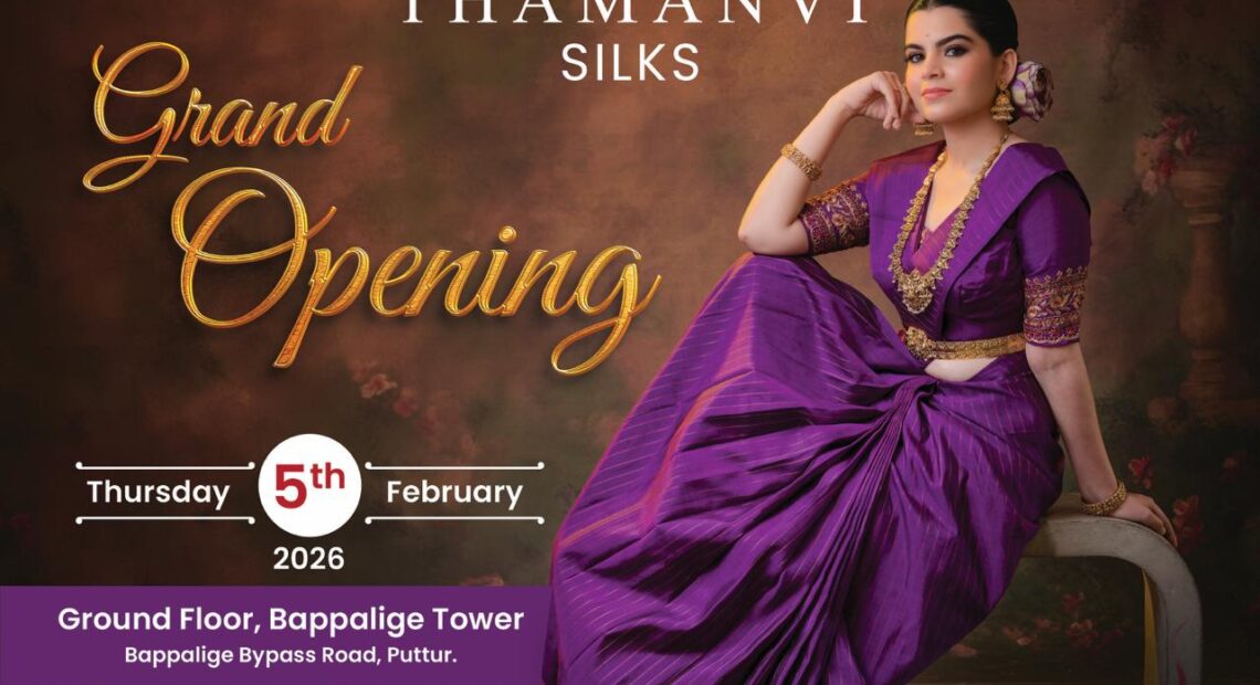 ಪುತ್ತೂರು ನಗರದ ಬಪ್ಪಳಿಗೆ ಬೈಪಾಸ್ ರಸ್ತೆಯಲ್ಲಿ ಬಪ್ಪಳಿಗೆ ಟವರ್ ನ ನೆಲ ಅಂತಸ್ತಿನಲ್ಲಿ ತಮನ್ವಿ ಸಿಲ್ಕ್ ಜ.೫ ರಂದು ಶುಭಾರಂಭಗೊಳ್ಳಲಿದೆ.