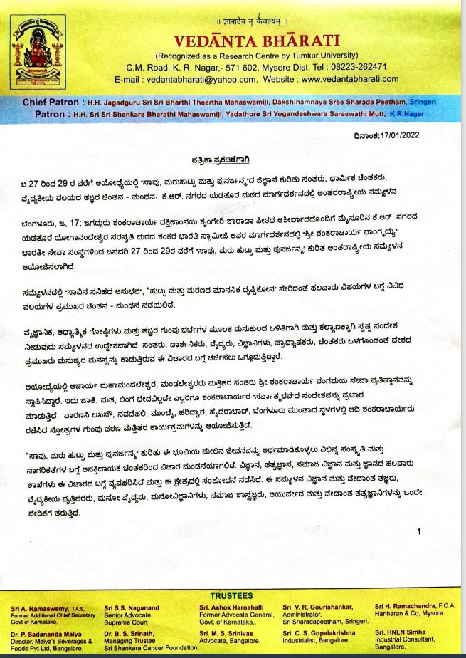 ಜ.27 ರಿಂದ 29 ರ ವರೆಗೆ ಅಯೋಧ್ಯೆಯಲ್ಲಿ “ಸಾವು, ಮರುಹುಟ್ಟು ಮತ್ತು ಪುನರ್ಜನ್ಮ”ದ ಜಿಜ್ಞಾಸೆ ಕುರಿತು ಸಂತರು, ಧಾರ್ಮಿಕ ಚಿಂತಕರು, ವೈದ್ಯಕೀಯ ವಲಯದ ತಜ್ಞರ ಚಿಂತನ – ಮಂಥನ: ಕೆ.ಆರ್. ನಗರದ ಯಡತೊರೆ ಮಠದ ಮಾರ್ಗದರ್ಶನದಲ್ಲಿ ಅಂತರರಾಷ್ಟ್ರೀಯ ಸಮ್ಮೇಳನ