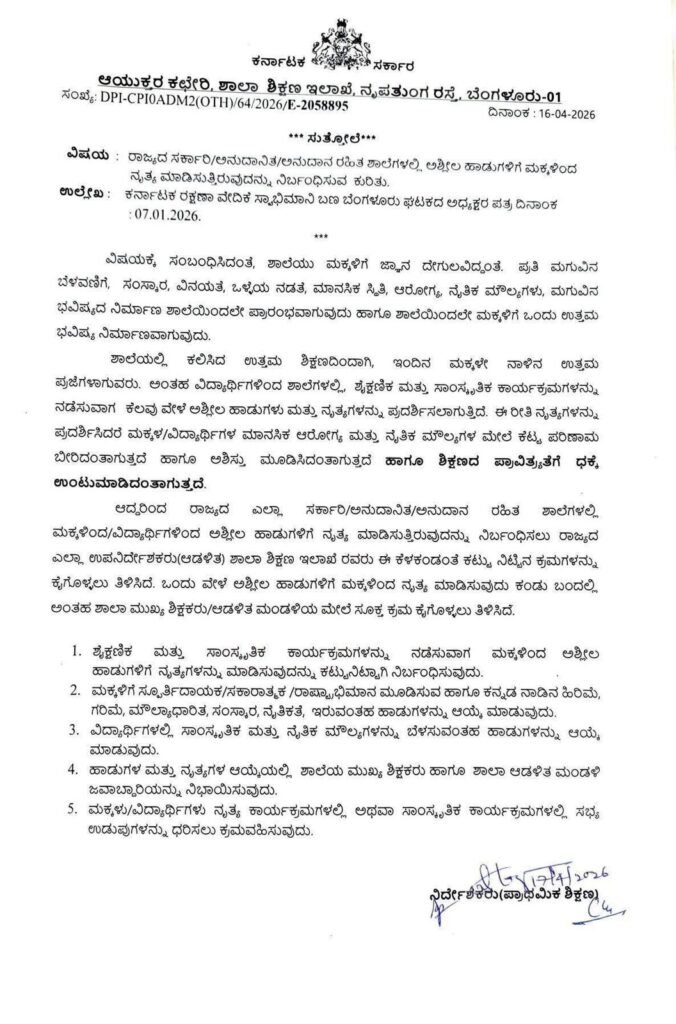 5. ಕಾನೂನು ಕ್ರಮ: ಒಂದು ವೇಳೆ ಸುತ್ತೋಲೆಯನ್ನು ಉಲ್ಲಂಘಿಸಿ ಅಶ್ಲೀಲ ನೃತ್ಯಗಳಿಗೆ ಅವಕಾಶ ನೀಡಿದರೆ ಸಂಬAಧಪಟ್ಟವರ ವಿರುದ್ಧ ಕಟ್ಟುನಿಟ್ಟಿನ ಶಿಸ್ತು ಕ್ರಮ ಜರುಗಿಸಲಾಗುವುದು.