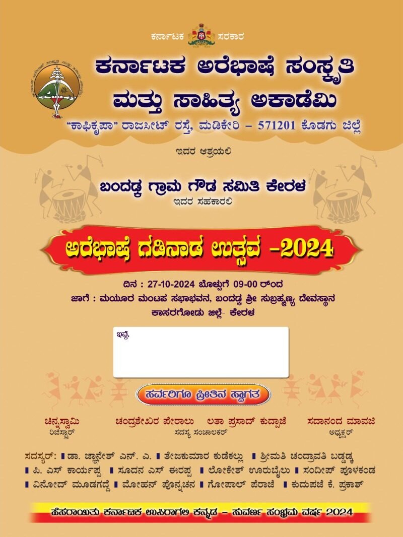 ಕರ್ನಾಟಕ ಅರೆಭಾಷೆ ಸಂಸ್ಕೃತಿ ಮತ್ತು ಸಾಹಿತ್ಯ ಅಕಾಡೆಮಿ ಇದರ ಆಶ್ರಯದಲ್ಲಿ ಬಂದಡ್ಕ ಗ್ರಾಮ ಗೌಡ ಸಮಿತಿ ಕೇರಳ ಇವರ ಸಹಕಾರದಲ್ಲಿ ಅರೆಭಾಷೆ ಗಡಿನಾಡ ಉತ್ಸವ -2024 ಅ.27ರಂದು ಬಂದಡ್ಕದ ಶ್ರೀ ಸುಬ್ರಹ್ಮಣ್ಯ ದೇವಸ್ಥಾನದ ಮಯೂರ ಮಂಟಪ ಸಭಾಭವನದಲ್ಲಿ ನಡೆಯಲಿದೆ.