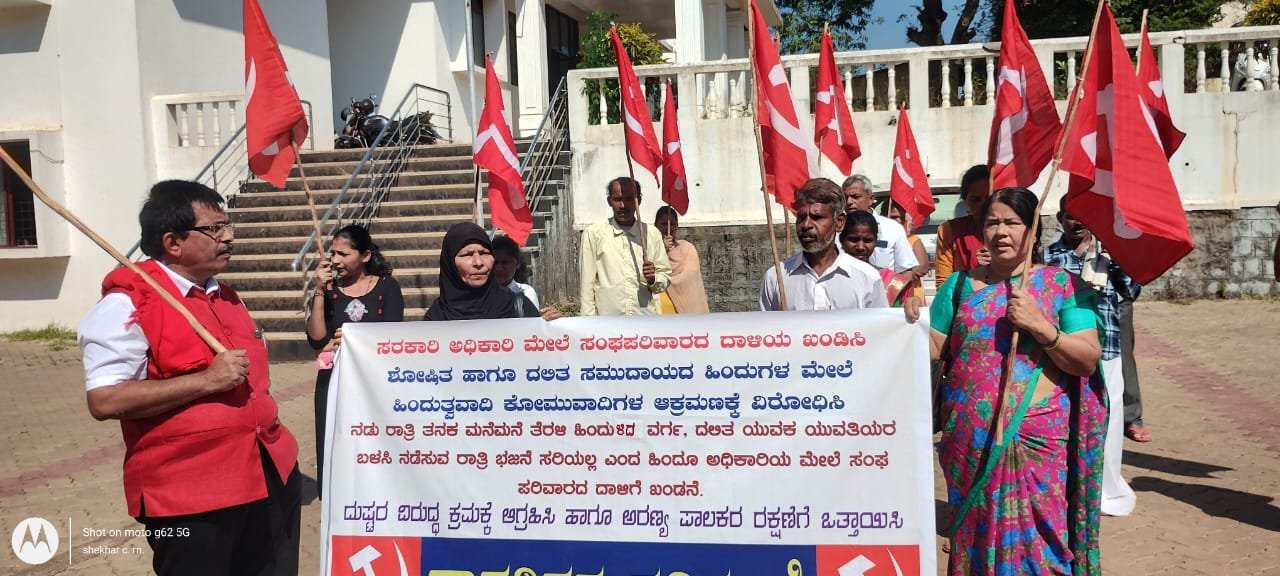 ಬೆಳ್ತಂಗಡಿ : ಉಪ ಅರಣ್ಯಾಧಿಕಾರಿ ಸಂಜೀವ ಪೂಜಾರಿ ಅವರಿಗೆ ಸಂಘಪರಿವಾರಗಳ ಬೆದರಿಕೆ ಇರುವ ಕಾರಣ ಅವರಿಗೆ ರಕ್ಷಣೆಗೆ ಆಗ್ರಹಿಸಿ ಹಾಗೂ ಸಂಘಪರಿವಾರದ ಹಿಂದುತ್ವವಾದಿಗಳು ಜಾತ್ಯಾತೀತವಾದ ಹಿಂದು ಧರ್ಮದ ಮಾನ ತೆಗೆಯವುದರ ವಿರುದ್ದ, ಹಿಂದುಗಳ ದೇವರ ಸ್ಮರಣೆಯ ಭಾಗವಾದ ಭಜನೆಯನ್ನು ಗೇಲಿ ಮಾಡುವಂತೆ ಪೋಲೀಸ್ಟೇಶನ್ ಎದುರು ಭಜನೆ ನಡೆಸಿ ಹಿಂದುಗಳಿಗೆ ಅವಮಾನಿಸಿದ ಸಂಘಪರಿವಾರದ ವಿರುದ್ದ ಹಾಗೂ ಹಿಂದುಳಿದ , ದಲಿತ ವರ್ಗದವರ ಧ್ವನಿ ಅಡಗಿಸುವ ಕುತಂತ್ರ ನಡೆಸುವ ಹಿಂದುತ್ವವಾದಿಗಳಿಂದ ಹಿಂದು ಧರ್ಮವನ್ನು ರಕ್ಷಣೆ ಮಾಡಬೇಕು ಆ ಮೂಲಕ ದುಡಿಯುವ ಜನರ ಹಿತಾಸಕ್ತಿಗೆ ರಕ್ಷಣೆ ನೀಡಲು ಒತ್ತಾಯಿಸಿ ಬೆಳ್ತಂಗಡಿ ತಾಲೂಕು ಕಚೇರಿ ಎದುರು ದಲಿತ ಹಕ್ಕು ಹೋರಾಟ ಸಮಿತಿ ನೇತೃತ್ವದಲ್ಲಿ ಪ್ರತಿಭಟನೆ ನಡೆಸಲಾಯಿತು