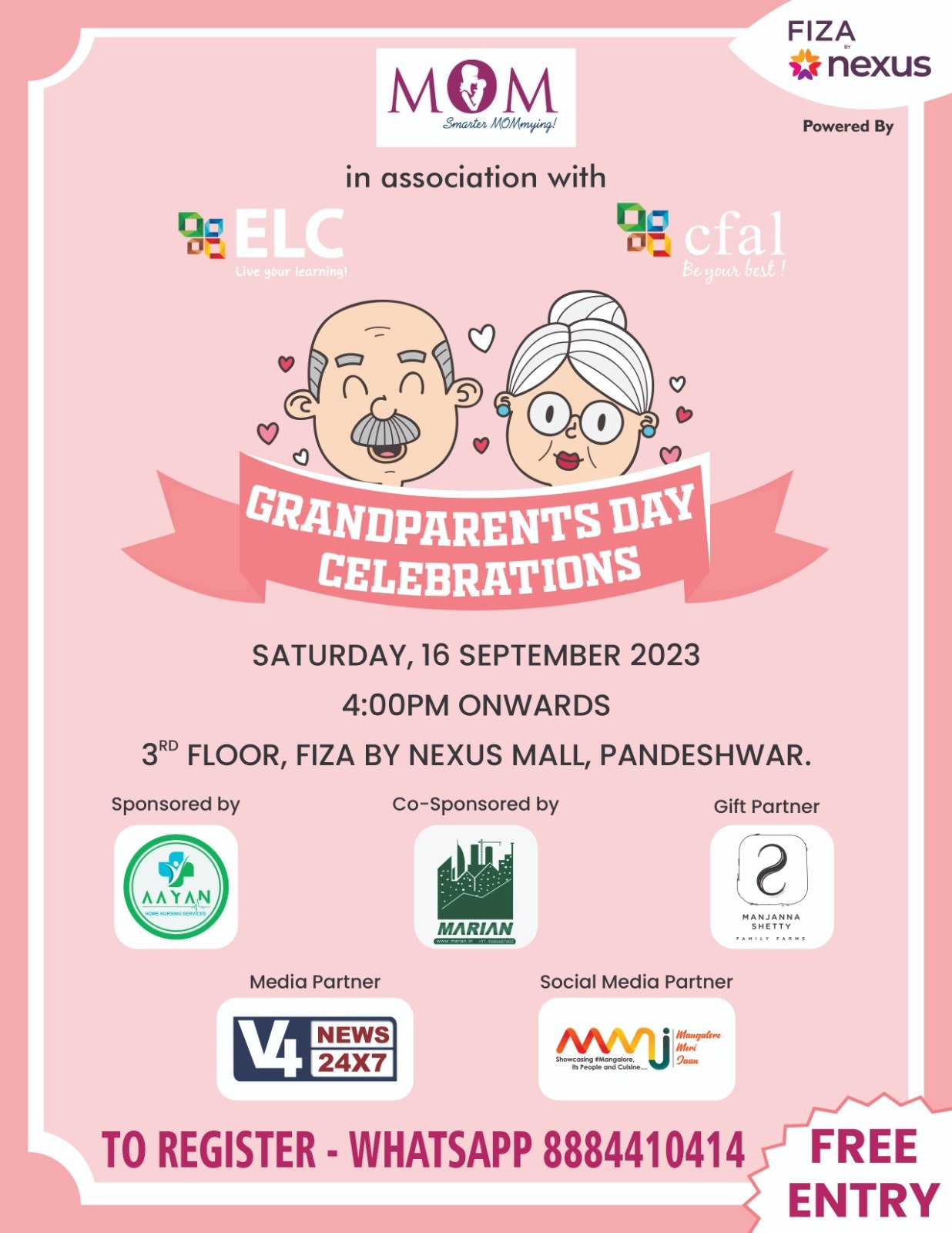 ಮೋಮ್ ವತಿಯಿಂದ ಇಎಲ್ಸಿ ಮತ್ತು ಸಿಎಫ್ಎಎಲ್ ಸಹಯೋಗದೊಂದಿಗೆ ಸೆ.16ರಂದು ಅಜ್ಜ ಅಜ್ಜಿಯರ ದಿನದ ಆಚರಣೆ ಕಾರ್ಯಕ್ರಮವು ನಗರದ ಫಿಜ್ಜಾ ಬೈ ನೆಕ್ಸಸ್ ಮಾಲ್ನಲ್ಲಿ ನಡೆಯಲಿದೆ.