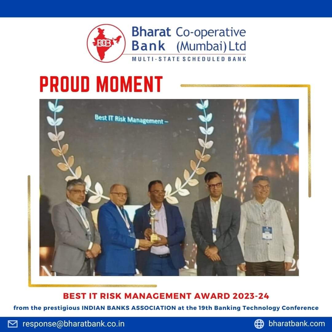 ಮುಂಬೈನಲ್ಲಿ ನಡೆದ 19 ನೆಯ ಬ್ಯಾಂಕಿಂಗ್ ತಂತ್ರಜ್ಞಾನ ಸಮ್ಮೇಳನದಲ್ಲಿ *ಪ್ರತಿಷ್ಠಿತ ಇಂಡಿಯನ್ ಬ್ಯಾಂಕ್ಸ್ ಅಸೋಸಿಯೇಷನ್ (IBA) ನಿಂದ ಭಾರತ್ ಕೋ-ಅಪರೇಟಿವ್ ಬ್ಯಾಂಕ್ “ಅತ್ಯುತ್ತಮ ಐಟಿ ರಿಸ್ಕ್ ಮ್ಯಾನೇಜ್ಮೆಂಟ್ ಪ್ರಶಸ್ತಿ” ಯನ್ನು ಪಡೆದುಕೊಂಡಿದೆ.