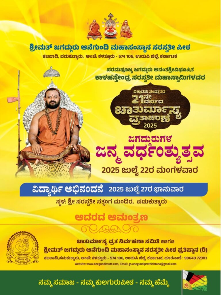 ಶ್ರೀಮತ್ ಜಗದ್ಗುರು ಆನೆಗುಂದಿ ಮಹಾಸಂಸ್ಥಾನ ಸರಸ್ವತೀ ಪೀಠ, ಪರಮಪೂಜ್ಯ ಜಗದ್ಗುರು ಅನಂತಶ್ರೀವಿಭೂಷಿತ ಕಾಳಹಸ್ತೇಂದ್ರ ಸರಸ್ವತೀ ಮಹಾಸ್ವಾಮಿಗಳವರ ವಿಶ್ವವಾಸು ಸಂವತ್ಸರದ ೨೧ನೇ ವರ್ಷದ ಚಾತುರ್ಮಾಸ್ಯ ವೃತಾಚರಣೆ ಜಗದ್ಗುರುಗಳ ಜನ್ಮ ವರ್ಧಂತ್ಯುತ್ಸವ ಜುಲೈ ೨೨ರಂದು ನಡೆಯಲಿದ್ದು, ವಿದ್ಯಾರ್ಥಿ ಅಭಿನಂದನೆ ಜುಲೈ ೨೭ರಂದು ಪಡುಕುತ್ಯಾರು ಶ್ರೀ ಸರಸ್ವತೀ ಸತ್ಸಂಗ ಮಂದಿರದಲ್ಲಿ ನಡೆಯಲಿದೆ.