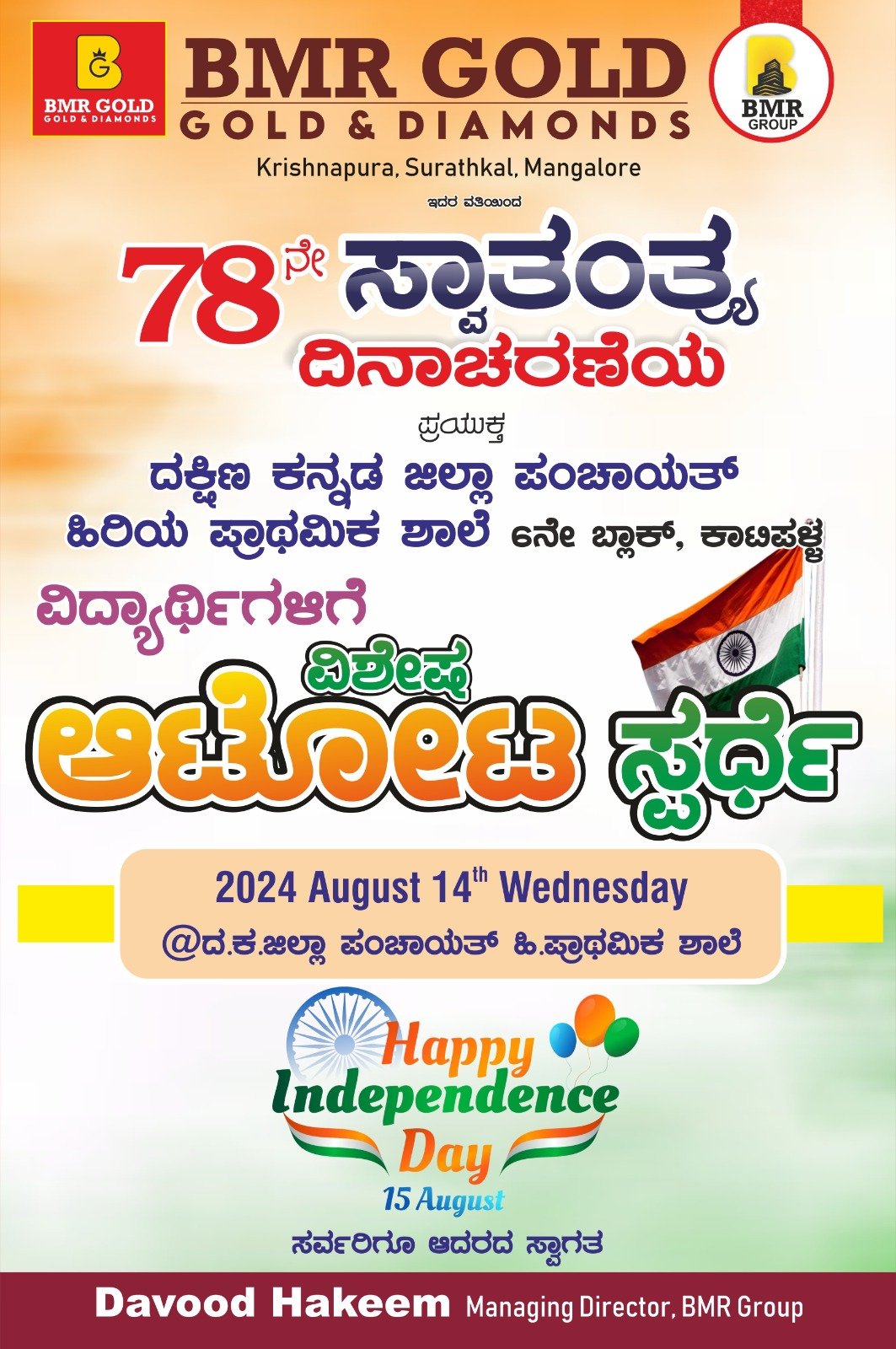 ಬಿಎಂಆರ್ ಗೋಲ್ಡ್ & ಡೈಮಂಡ್ಸ್ ವತಿಯಿಂದ 78ನೇ ಸ್ವಾತಂತ್ರ್ಯ ದಿನಾಚರಣೆಯ ಪ್ರಯುಕ್ತ ಆ.14ರಂದು ವಿದ್ಯಾರ್ಥಿಗಳಿಗೆ ವಿವಿಧ ಆಟೋಟ ಸ್ಪರ್ಧೆ