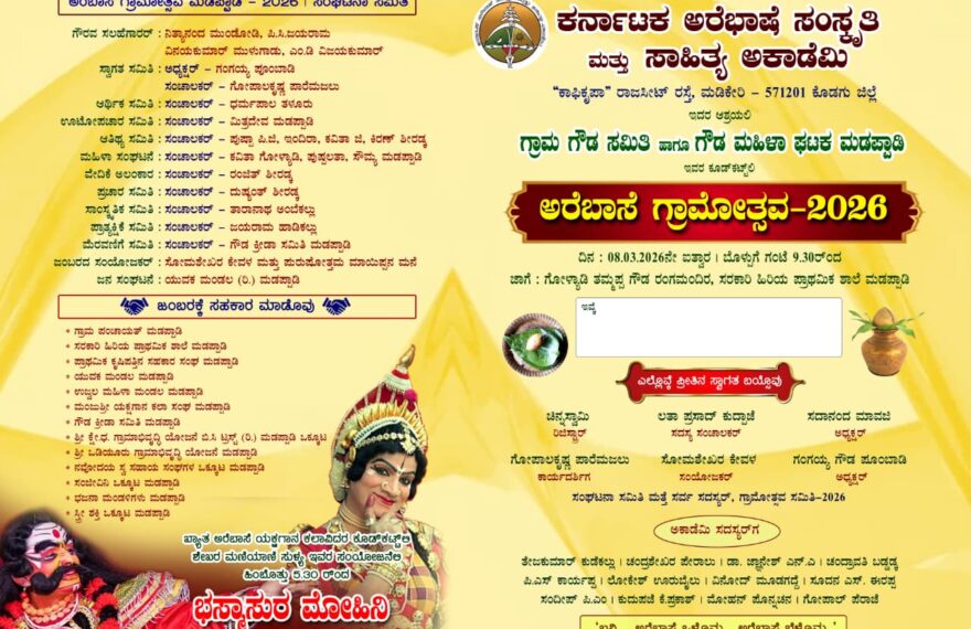 ಕರ್ನಾಟಕ ಅರೆಭಾಷೆ ಸಂಸ್ಕೃತಿ ಮತ್ತು ಸಾಹಿತ್ಯ ಅಕಾಡೆಮಿ ಹಾಗೂ ಮಡಪ್ಪಾಡಿಯ ಗ್ರಾಮ ಗೌಡ ಸಮಿತಿ ಮತ್ತು ಗೌಡ ಮಹಿಳಾ ಘಟಕಗಳ ಜಂಟಿ ಆಶ್ರಯದಲ್ಲಿ ಒಂದು ದಿನದ ‘ಅರೆಬಾಸೆ ಗ್ರಾಮೋತ್ಸವ –2026’ ಕಾರ್ಯಕ್ರಮವು ಮಾರ್ಚ್ 8ರಂದು ಜರುಗಲಿದೆ. ಅಲ್ಲಿನ ಸರಕಾರಿ ಹಿರಿಯ ಪ್ರಾಥಮಿಕ ಶಾಲೆಯ ಗೋಳ್ಯಾಡಿ ತಮ್ಮಪ್ಪ ಗೌಡ ರಂಗಮಂದಿರದಲ್ಲಿ ‘ಅರೆಬಾಸೆ ಒಳ್ಸೊಮ… ಅರೆಬಾಸೆ ಬೆಳ್ಸೊಮ..’ ಎಂಬ ಆಶಯದೊಂದಿಗೆ ಪೂರ್ವಾಹ್ನ ಗಂಟೆ 9.30ರಿಂದ ಜರುಗಲಿರುವ ಕಾರ್ಯಕ್ರಮವನ್ನು ಅರೆಭಾಷೆ ಅಕಾಡೆಮಿಯ
