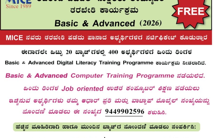 ಉಡುಪಿ ಗ್ರಾಮೀಣ ಬಂಟರ ಸಂಘದ ಚಾರಿಟೇಬಲ್ ಟ್ರಸ್ಟ್ ಕುಂತಳ ನಗರ, ಮಣಿಪುರ ಇವರ ಸಹಭಾಗಿತ್ವದಲ್ಲಿ ಉಡುಪಿ ಗ್ರಾಮೀಣ ಬಂಟರ ಚಾರಿಟೇಬಲ್ ಟ್ರಸ್ಟ್ ನ ಸ್ಕಿಲ್ ಡೆವಲಪ್ಮೆಂಟ್ ಸೆಂಟರ್ ನ ವತಿಯಿಂದ ಮೈಸ್ ಮೂಲಕ ಮೂಲಭೂತ ಮತ್ತು ಮುಂದುವರಿದ ಡಿಜಿಟಲ್ ಸಾಕ್ಷರತಾ ತರಬೇತಿ ಕಾರ್ಯಕ್ರಮದಡಿಯಲ್ಲಿ ಮೈಸ್ (MICE) ಅವರಿಂದ ಡಿಜಿಟಲ್ ಸಾಕ್ಷರತಾ ಕಂಪ್ಯೂಟರ್ ತರಬೇತಿ ಕಾರ್ಯಕ್ರಮ ಬೇಸಿಕ್ ಮತ್ತು ಅಡ್ವಾನ್ಸ್ಡ್ -(2026) Basic & Advanced ಕೋರ್ಸ್ ನ್ನು ಉಚಿತವಾಗಿ