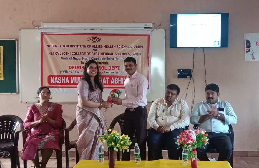 ಉಡುಪಿ: ನಗರದ ಪ್ರತಿಷ್ಠಿತ ನೇತ್ರಜ್ಯೋತಿ ಕಾಲೇಜಿನಲ್ಲಿ ಡ್ರಗ್ಸ್ ನಿಯಂತ್ರಣ ಇಲಾಖೆಯ ಸಹಯೋಗದೊಂದಿಗೆ ನಶಾಮುಕ್ತ ಭಾರತ ಅಭಿಯಾನ ಕಾರ್ಯಕ್ರಮ ನಡೆಯಿತು. ಕಾರ್ಯಕ್ರಮದಲ್ಲಿ ಮುಖ್ಯ ಅತಿಥಿಯಾಗಿ ಆಗಮಿಸಿದ ಉಡುಪಿಯ ಔಷಧ ನಿಯಂತ್ರಣ ಇಲಾಖೆಯ ಸಹಾಯಕ ಔಷಧ ನಿಯಂತ್ರಕರಾದ ಶಂಕರ್ ನಾಯಕರವರು ಮಾತನಾಡಿ ವಿದ್ಯಾರ್ಥಿಗಳು ದೇಶದ ಆಸ್ತಿ ಯಾವುದೇ ಕಾರಣಕ್ಕೂ ಡ್ರಗ್ಸ್ನ ಮಾಯಾಜಾಲಕ್ಕೆ ಒಳಗಾಗದಿರಿ ಎಂದು ವಿದ್ಯಾರ್ಥಿಗಳಿಗೆ ಕರೆ ನೀಡಿದರು. ಕಾರ್ಯಕ್ರಮದಲ್ಲಿ ಅಧ್ಯಕ್ಷತೆ ವಹಿಸಿ