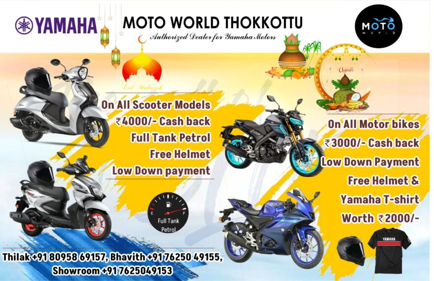 ಯಮಹಾದ ಅಧಿಕೃತ ಡೀಲರ್ಗಳಾದ ಮೊಟೊ ವರ್ಲ್ಡ್ ತೊಕ್ಕೊಟ್ಟು ವತಿಯಿಂದ ದ್ವಿಚಕ್ರ ವಾಹನ ಖರೀದಿಯ ಮೇಲೆ ವಿಶೇಷ ಆಫರ್ಗಳನ್ನು ಘೋಷಿಸಿದ್ದಾರೆ.ಯಮಹಾದ ಯಾವುದೇ ಮಾದರಿಯ ಸ್ಕೂಟರ್ ಖರೀದಿಸಿದರೆ ನಾಲ್ಕು ಸಾವಿರ ಕ್ಯಾಶ್ಬ್ಯಾಕ್, ಪುಲ್ ಟ್ಯಾಂಕ್ ಪೆಟ್ರೋಲ್, ಉಚಿತ ಹೆಲ್ಮೆಟ್ ಮತ್ತು ಕಡಿಮೆ ಡೌನ್ ಪೇಮೆಂಟ್ ವ್ಯವಸ್ಥೆಯೂ ಇದೆ.ಇನ್ನು ಯಮಹಾದ ಯಾವುದೇ ಮಾದರಿಯ ಮೋಟಾರ್ ಬೈಕ್ ಖರೀದಿಸಿದರೆ, ೩ ಸಾವಿರ ರೂಪಾಯಿ ಕ್ಯಾಶ್ಬ್ಯಾಕ್, ಕಡಿಮೆ ಡೌನ್ಪೇಮೆಂಟ್, ಉಚಿತ ಹೆಲ್ಮೆಟ್,