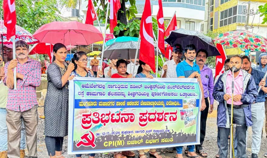 ಪಡೀಲ್ ಪಂಪ್ವೆಲ್ ರಸ್ತೆ ಅವ್ಯವಸ್ಥೆ: ತ್ವರಿತಗತಿಯಲ್ಲಿ ಕಾಮಗಾರಿ ಪೂರ್ಣಗೊಳಿಸಲು ಒತ್ತಾಯಿಸಿ ಸಿಪಿಐಎಂ ನಿಂದ ಪ್ರತಿಭಟನೆ