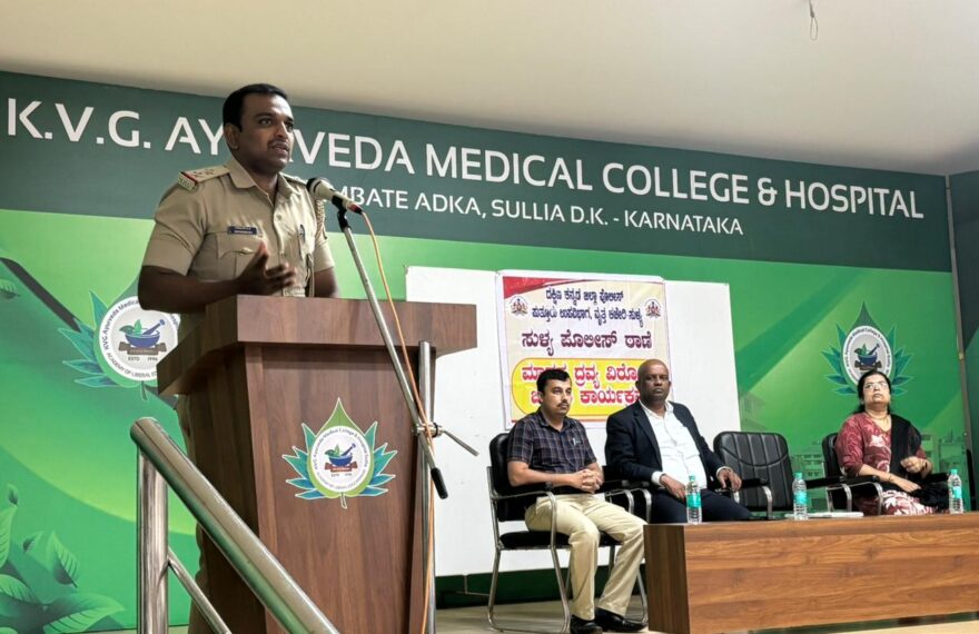 ಕೆ ವಿ ಜಿ ಆಯುರ್ವೇದ ಮೆಡಿಕಲ್ ಕಾಲೇಜು ಮತ್ತು ಆಸ್ಪತ್ರೆ ಸುಳ್ಯದಲ್ಲಿ ಅ. 03 ರಂದು ಸುಳ್ಯ ಪೊಲೀಸ್ ಠಾಣೆಯ ಸಹಯೋಗದೊಂದಿಗೆ ಮಾದಕ ವಸ್ತು ಜಾಗೃತಿ ಹಾಗೂ ಸೈಬರ್ ಕ್ರೈಂ ಕುರಿತು ಮಾಹಿತಿ ಕಾರ್ಯಾಗಾರವು ಕಾಲೇಜಿನ ಧನ್ವಂತರಿ ಸಭಾಂಗಣದಲ್ಲಿ ನಡೆಯಿತು. ಈ ಕಾರ್ಯಾಗಾರದಲ್ಲಿ ಸುಳ್ಯ ಪೊಲೀಸ್ ಠಾಣೆಯ ಉಪ ನಿರೀಕ್ಷಕರಾದ ಶ್ರೀಯುತ ಸಂತೋಷ್ ಬಿ ಪಿ ರವರು ಮಾಹಿತಿಯನ್ನು ನೀಡುತ್ತಾ ಮಾದಕ ವ್ಯಸನ ಹಾಗೂ ಸೈಬರ್ ಕ್ರೈಂನಿಂದ ಉಂಟಾಗುವ ತೊಂದರೆ ಹಾಗೂ ಇದನ್ನು ತಡೆಯುವ ಕುರಿತು