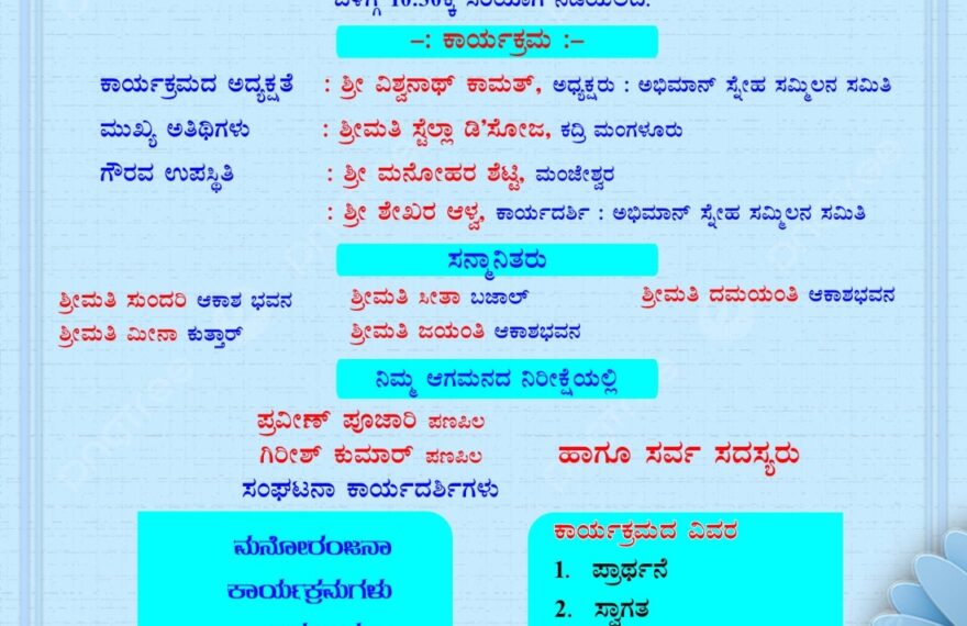 2001ರಿಂದ 2022ರವರೆಗೆ ಮಂಗಳೂರಿನಲ್ಲಿದ್ದ ಉದ್ಯೋಗಿಗಳಿಗಾಗಿ ಅಭಿಮಾನ್ ಸ್ನೇಹ ಸಮ್ಮಿಲನ-2025 ಎಂಬ ಸ್ನೇಹ ಸಮಾಗಮ ಕಾರ್ಯಕ್ರಮವು ನಗರದ ಜ್ಯೋತಿ ವೃತ್ತದ ಬಳಿಯ ಹೊಟೇಲ್ ಕ್ವಾಲಿಟಿಯ ಎಸಿ ಸಭಾಂಗಣದಲ್ಲಿ ಜ.19ರಂದು ನಡೆಯಲಿದೆ. ಜ.19ರಂದು ಬೆಳಿಗ್ಗೆ 10.30ಕ್ಕೆ ನಡೆಯಲಿರುವ ಕಾರ್ಯಕ್ರಮದ ಅಧ್ಯಕ್ಷತೆಯನ್ನು ಅಭಿಮಾನ್ ಸ್ನೇಹ ಸಮ್ಮಿಲನ ಸಮಿತಿಯ ಅಧ್ಯಕ್ಷರಾದ ವಿಶ್ವನಾಥ್ ಕಾಮತ್ ವಹಿಸಲಿದ್ದಾರೆ. ಮುಖ್ಯ ಅತಿಥಿಗಳಾಗಿ ಮಂಗಳೂರಿನ ಕದ್ರಿಯ ಸ್ಟೆಲ್ಲಾ ಡಿ’ಸೋಜಾ,