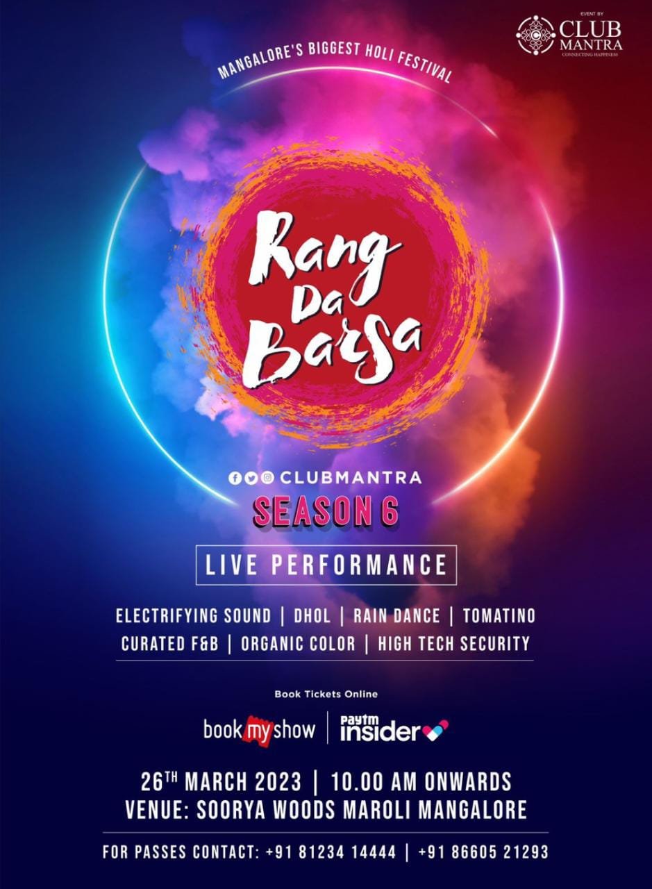 ಕ್ಲಬ್ ಮಂತ್ರ ವತಿಯಿಂದ ಮಂಗಳೂರಿನಲ್ಲಿ ಅತಿ ದೊಡ್ಡ ಹೋಲಿ ಹಬ್ಬವನ್ನು ಮಾರ್ಚ್ 26ರಂದು ಆಯೋಜನೆ ಮಾಡಿದ್ದಾರೆ. ಇವಿಎಮ್ ಪ್ರೆಸೆಂಟ್ಸ್ ರಂಗ್ ದ ಬರ್ಸ ಸೀಸನ್-6 ನಗರದ ಮರೋಳಿಯ ಸೂರ್ಯವುಡ್ಸ್ನಲ್ಲಿ ಅದ್ಧೂರಿಯ ಕಾರ್ಯಕ್ರಮ ನಡೆಯಲಿದೆ.