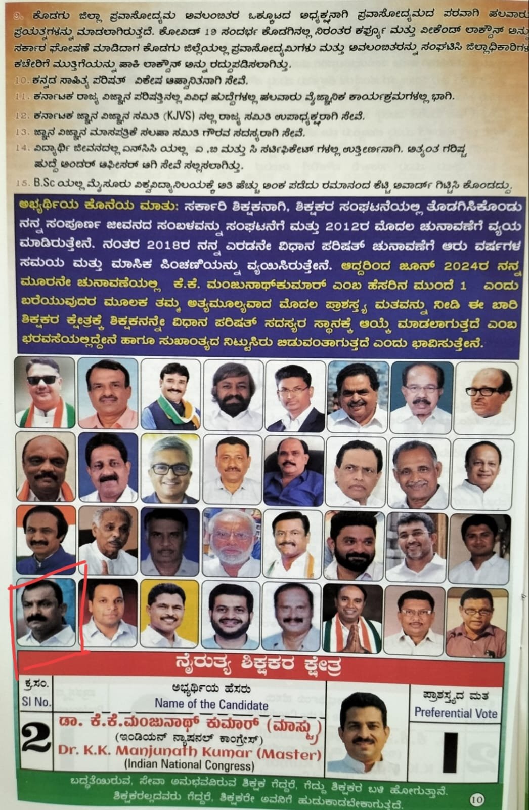 ಶಿಕ್ಷಕರ ಕ್ಷೇತ್ರದ ಕಾಂಗ್ರೆಸ್ ಅಭ್ಯರ್ಥಿ ಡಾಕ್ಟರ್ ಕೆ.ಕೆ.ಮಂಜುನಾಥ್ ಕುಮಾರ್ ಅವರ ಚುನಾವಣಾ ಪ್ರಚಾರ ಪತ್ರದಲ್ಲಿ ಈ ಎಡವಟ್ಟು ಕಂಡು ಬಂದಿದ್ದು ಸಾಕಷ್ಟು ಚರ್ಚೆಗೆ ಕಾರಣವಾಗಿದೆ.