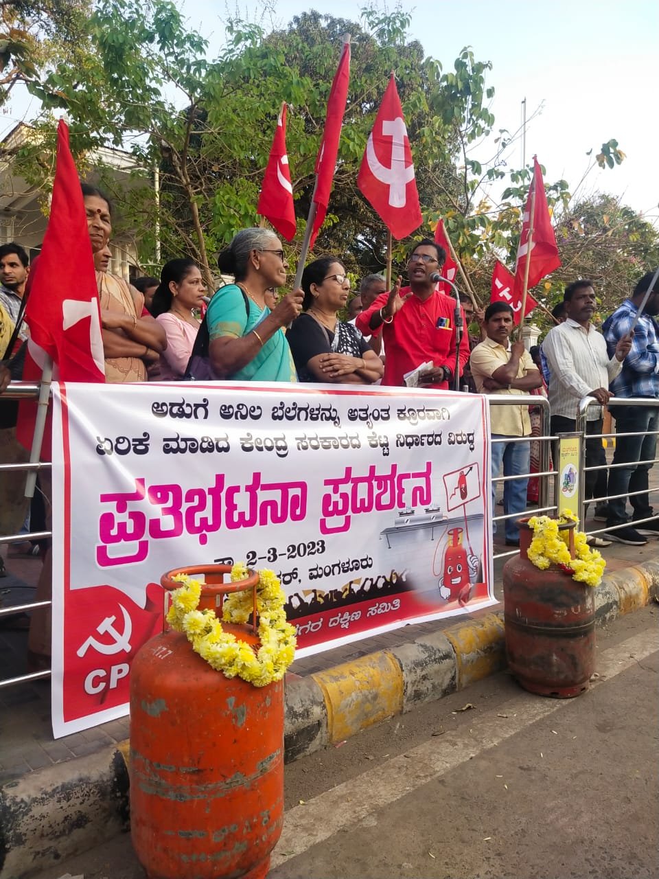 ಅಡುಗೆ ಅನಿಲ ಬೆಲೆಗಳನ್ನು ಅತ್ಯಂತ ಕ್ರೂರವಾಗಿ ಏರಿಕೆ ಮಾಡಿದ ಕೇಂದ್ರ ಸರಕಾರದ ಕೆಟ್ಟ ನಿರ್ಧಾರದ ವಿರುದ್ಧ ಸಿಪಿಐಎಂ ಮಂಗಳೂರು ನಗರ ದಕ್ಷಿಣ ಸಮಿತಿ ನೇತೃತ್ವದಲ್ಲಿ ಇಂದು (2-3-2023) ನಗರದ ಕ್ಲಾಕ್ ಟವರ್ ಬಳಿ ಅಡುಗೆ ಖಾಲಿ ಅಡುಗೆ ಅನಿಲ ಸಿಲಿಂಡರ್ ಪ್ರದರ್ಶಿಸಿ ಪ್ರತಿಭಟನಾ ಪ್ರದರ್ಶನ ನಡೆಸಲಾಯಿತು.