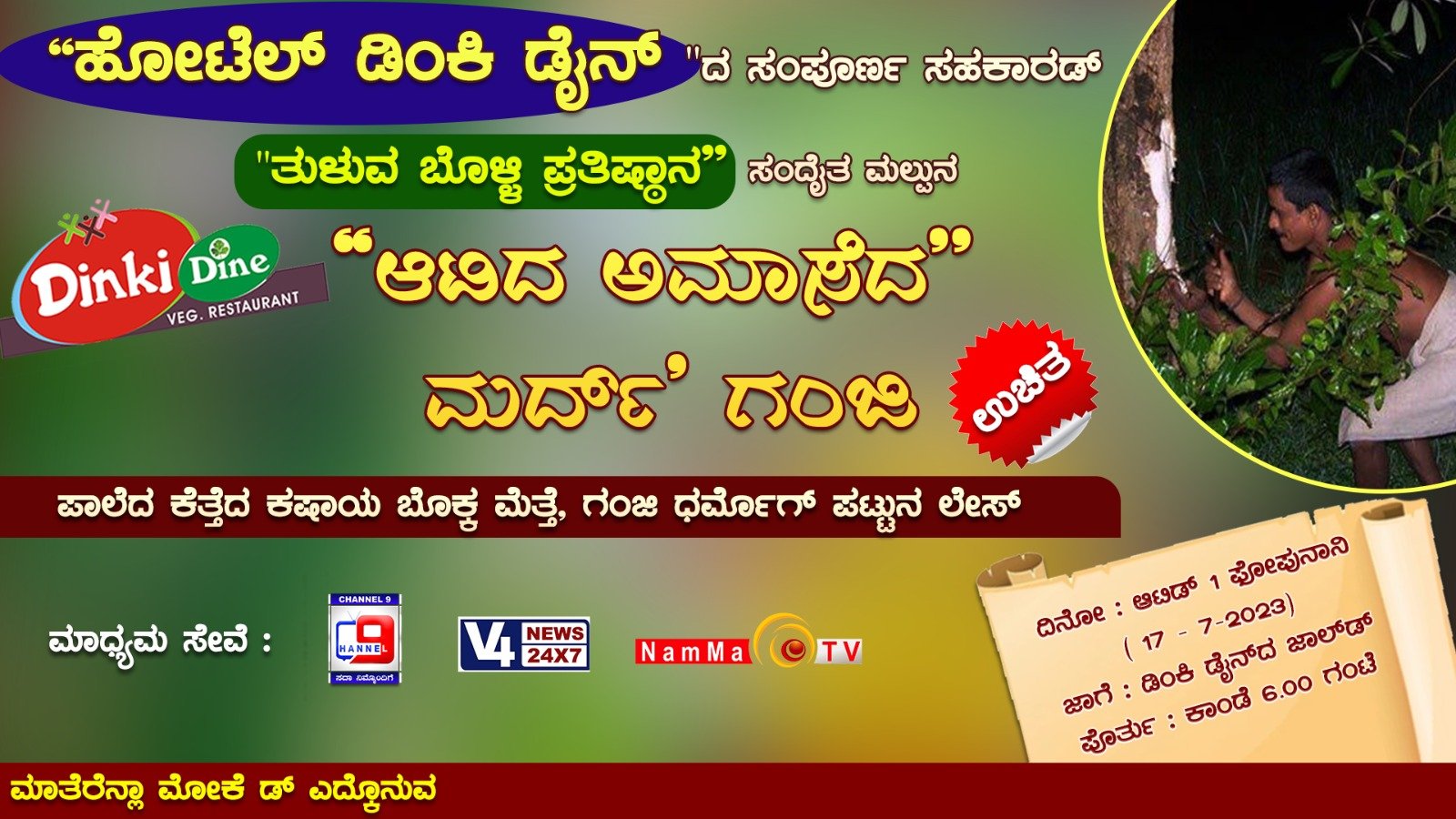 ಹೋಟೆಲ್ ಡಿಂಕಿ ಡೈನ್ನ ಸಹಕಾರದಲ್ಲಿ ತುಳುವ ಬೊಳ್ಳಿ ಪ್ರತಿಷ್ಠಾನದ ವತಿಯಿಂದ ಆಟಿದ ಅಮಾವಾಸ್ಯೆಯ ಪ್ರಯುಕ್ತ ಉಚಿತ ಹಾಲೆ ಮರದ ಕೆತ್ತೆಯ ಕಷಾಯ ಮತ್ತು ಮೆಂತೆ ಗಂಜಿಯ ವಿತರಣಾ ಕಾರ್ಯಕ್ರಮ ಜುಲೈ 17ರಂದು ಹಮ್ಮಿಕೊಳ್ಳಲಾಗಿದೆ. ನಗರದ ಕದ್ರಿಯಲ್ಲಿರುವ ಡಿಂಕಿ ಡೈನ್ ಹೋಟೆಲ್ನ ಆವರಣದಲ್ಲಿ ಬೆಳಗ್ಗೆ 6 ಗಂಟೆಗೆ ವಿತರಿಸಲಿದ್ದಾರೆ. ಎಲ್ಲರೂ ಇದರ ಸದುಪಯೋಗವನ್ನು ಪಡೆದುಕೊಳ್ಳಿ ಎಂದು ತುಳು ವಾಗ್ಮಿ ದಯಾನಂದ ಕತ್ತಲ್ಸಾರ್ ತಿಳಿಸಿದ್ದಾರೆ