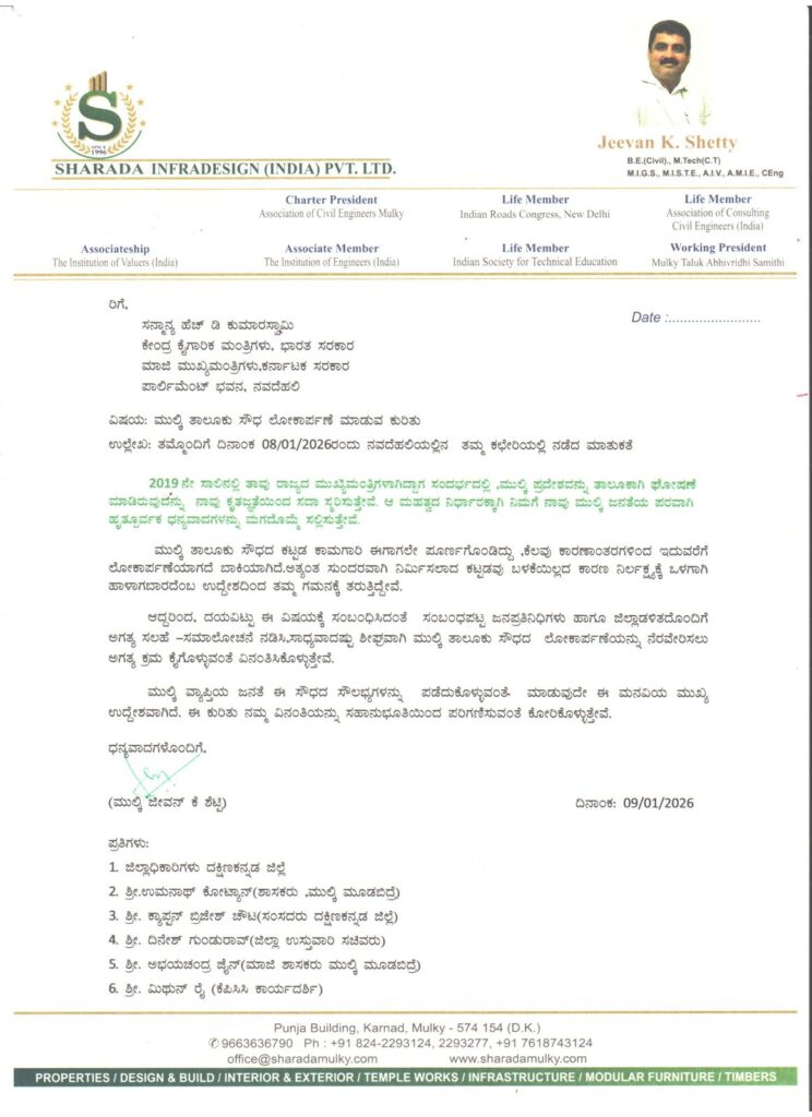 ಮುಲ್ಕಿ ಸಿವಿಲ್ ಇಂಜಿನಿಯರ್ಸ್ ಅಸೋಸಿಯೇಷನ್ನ ಸಂಸ್ಥಾಪಕ ಅಧ್ಯಕ್ಷರಾದ Er.ಮುಲ್ಕಿ ಜೀವನ್ ಕೆ. ಶೆಟ್ಟಿ ಅವರು, ಕೇಂದ್ರ ಭಾರಿ ಕೈಗಾರಿಕೆ ಮತ್ತು ಉಕ್ಕು ಸಚಿವರು ಹಾಗೂ ಕರ್ನಾಟಕದ ಮಾಜಿ ಮುಖ್ಯಮಂತ್ರಿಗಳಾದ ಶ್ರೀ ಎಚ್. ಡಿ. ಕುಮಾರಸ್ವಾಮಿ ಅವರನ್ನು ಭೇಟಿ ಮಾಡಿ, ಮುಲ್ಕಿ ಜನತೆಯ ಬಹುದಿನಗಳ ಕನಸಾದ ಮುಲ್ಕಿ ತಾಲೂಕು ಸೌಧವನ್ನು ತಕ್ಷಣ ಉದ್ಘಾಟಿಸಿ ಸಾರ್ವಜನಿಕ ಸೇವೆಗೆ ಅರ್ಪಿಸುವಂತೆ, ಆಯ್ಕೆಯಾದ ಜನಪ್ರತಿನಿಧಿಗಳು ಮತ್ತು ಜಿಲ್ಲಾ ಆಡಳಿತದೊಂದಿಗೆ ಸಮನ್ವಯ ಸಾಧಿಸಿ ಅಗತ್ಯ ಹಸ್ತಕ್ಷೇಪ ಮಾಡುವಂತೆ ಹೃದಯಪೂರ್ವಕವಾಗಿ ಮನವಿ ಮಾಡಿದರು.