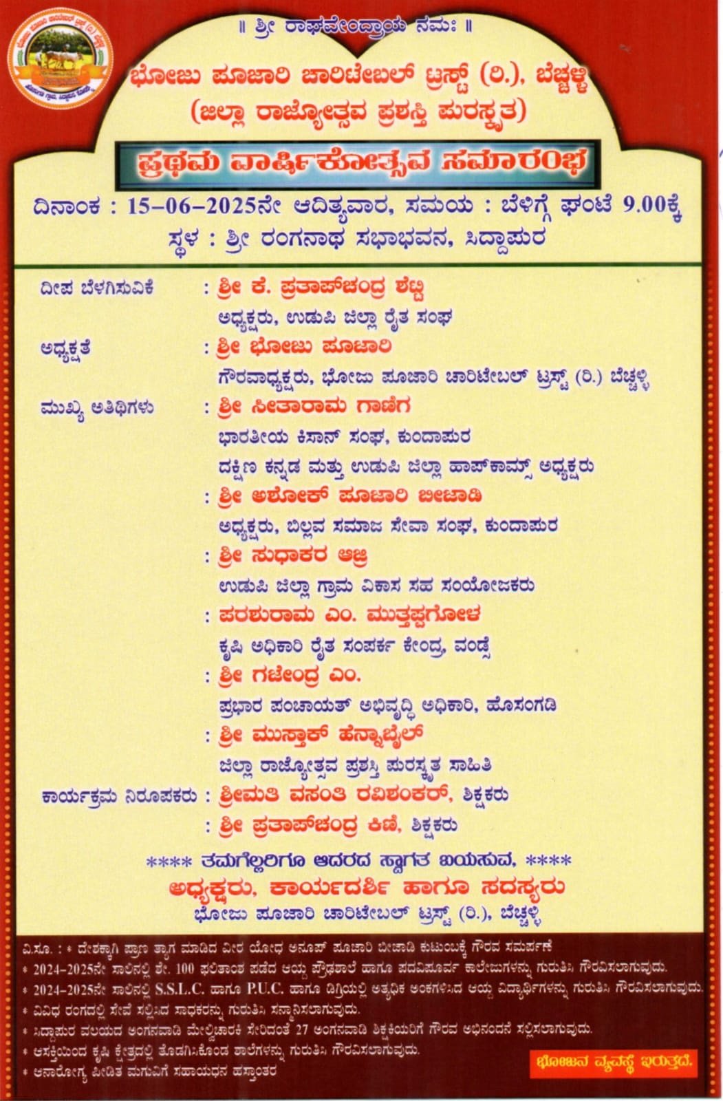 ಕೃಷಿಯನ್ನು ತೊಡಗಿಸಿಕೊಂಡ ಶಾಲೆಗಳನ್ನು ಗುರುತಿಸಿ ಗೌರವಿಸುವುದು ಮತ್ತು ಅನಾರೋಗ್ಯ ಪೀಡಿತ ಮಗುವಿಗೆ ಸಹಾಯಧನ ಹಸ್ತಾಂತರ ಕಾರ್ಯಕ್ರಮ ಹಮ್ಮಿಕೊಂಡಿದ್ದಾರೆ, ಸಾರ್ವಜನಿಕರು ಅತೀ ಹೆಚ್ಚಿನ ಸಂಖ್ಯೆಯಲ್ಲಿ ಭಾಗವಹಿಸಿ ಕಾರ್ಯಕ್ರಮವನ್ನು ಚೆಂದಗಾಣಿಸಿ ಕೊಡಬೇಕೆಂದು ಪ್ರಕಟಣೆಯಲ್ಲಿ ಭೋಜು ಪೂಜಾರಿ ಚಾರಿಟೇಬಲ್ ಟ್ರಸ್ಟಿ ನ ಗೌರವಾಧ್ಯಕ್ಷರು ಹಾಗೂ ಪದಾಧಿಕಾರಿಗಳು ವಿನಂತಿಸಿದ್ದಾರೆ.