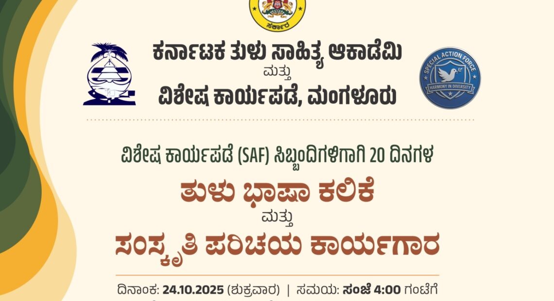 ಅ.24 : ವಿಶೇಷ ಕಾರ್ಯಪಡೆ ಸಿಬ್ಬಂದಿಗಳಿಗಾಗಿ ತುಳು ಭಾಷಾ ಕಲಿಕೆ ಮತ್ತು ಸಂಸ್ಕೃತಿ ಪರಿಚಯ ಕಾರ್ಯಗಾರ ಉದ್ಘಾಟನೆ