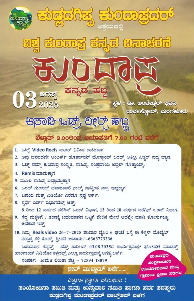 ಪ್ರತಿವರ್ಷದಂತೆ, ಈ ವರ್ಷವೂ ” ಕುಂದಾಪ್ರ ಕನ್ನಡ ಹಬ್ಬ 2025″ ನ್ನು ಆಗಸ್ಟ್ 3, 2025 ರ ಭಾನುವಾರ ಬೆಳಿಗ್ಗೆ 9 ರಿಂದ ಸಂಜೆ 7ರತನಕ, ಅಂಬೇಡ್ಕರ್ ಭವನ, ಉರ್ವ ಸ್ಟೋರ್ಸ್ ಮಂಗಳೂರಲ್ಲಿ ಆಚರಿಸಲು ನಿರ್ಧರಿಸಿದ್ದಾರೆ ಎಂದು ಆಯೋಜನಾ ಸಮಿತಿಯ ಕಾರ್ಯದರ್ಶಿಯವರಾದ ಶ್ರೀಮತಿ ಲಿಖಿತಾ ಶೆಟ್ಟಿ ಬೂದಾಡಿಯವರು ತಿಳಿಸಿರುತ್ತಾರೆ.