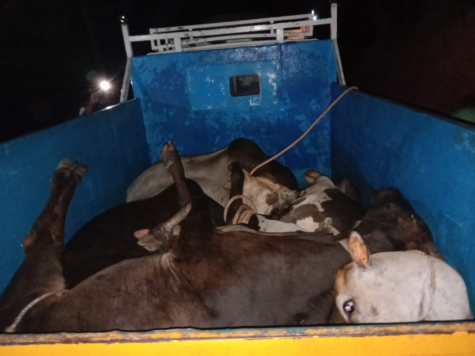 ವಾಹನದ ಹಿಂದುಗಡೆ ಮೀನಿನ ಪ್ಲಾಸ್ಟಿಕ್ ಟ್ರೇಗಳನ್ನ ರಾಶಿ ಹಾಕಲಾಗಿದ್ದು ಅದರೊಳಗಡೆ ಸದ್ದು ಕೇಳಿಸಿದಾಗ ಒಳಗಡೆ 5 ಜಾನುವಾರುಗಳನ್ನು ಉಸಿರುಗಟ್ಟಿಸಿ ಕಟ್ಟಿ ಹಾಕಿರುವುದನ್ನು ಸಹಾಯಕ್ಕೆ ಬಂದವರು ಕಂಡಿದ್ದಾರೆ. ತಕ್ಷಣ ವಾಹನದಲ್ಲಿದ್ದ ಚಾಲಕ ಸೇರಿ ಇಬ್ಬರು ಪರಾರಿಯಾಗಿದ್ದು, ಎಸ್ಕಾರ್ಟ್ ನೀಡುತ್ತಿದ್ದ ಇಬ್ಬರು ಬೈಕುಗಳನ್ನು ಬಿಟ್ಟು ಪರಾರಿಯಾಗಿದ್ದಾರೆ.