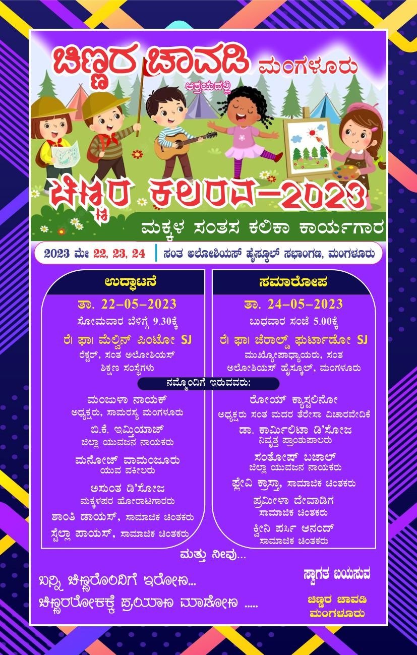 ಚಿಣ್ಣರ ಚಾವಡಿ ಮಂಗಳೂರು ಆಶ್ರಯದಲ್ಲಿ ಮೇ 22ರಿಂದ 24ರವರೆಗೆ ನಗರದ ಸಂತ ಅಲೋಶಿಯಸ್ ಹೈಸ್ಕೂಲ್ ನ ಸಭಾಂಗಣದಲ್ಲಿ ಚಿಣ್ಣರ ಕಲರವ – 2023 ಮಕ್ಕಳ ಸಂತಸ ಕಲಿಕಾ ಕಾರ್ಯಗಾರವು ಜರುಗಲಿದೆ.