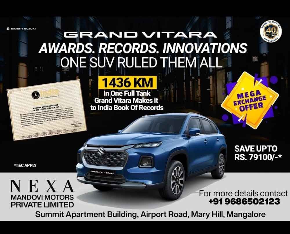ಮಾರುತಿ ಸುಜುಕಿಯ ಗ್ರಾಂಡ್ ವಿತಾರ ಕಾರು ಒಂದು ಫುಲ್ ಟ್ಯಾಂಕ್ನಲ್ಲಿ 1436 ಕಿ.ಮೀ ಮೈಲೇಜು ನೀಡುವುದರೊಂದಿಗೆ ಇಂಡಿಯಾ ಬುಕ್ ಆಫ್ ರೆಕಾರ್ಡ್ ಮಾಡುವ ಮೂಲಕ ದಾಖಲೆ ಬರೆದಿದ್ದು, ಮಂಗಳೂರಿನ ನೆಕ್ಸಾ ಮಾಂಡೋವಿ ಮೋಟಾರ್ಸ್ ಪ್ರೈವೇಟ್ ಲಿಮಿಟೆಡ್ ಶೋರೂಂನಲ್ಲಿ ಮೇಘಾ ಎಕ್ಸ್ಚೇಂಜ್ ಆಫರ್ಗಳು ಘೋಷಿಸಲಾಗಿದೆ.