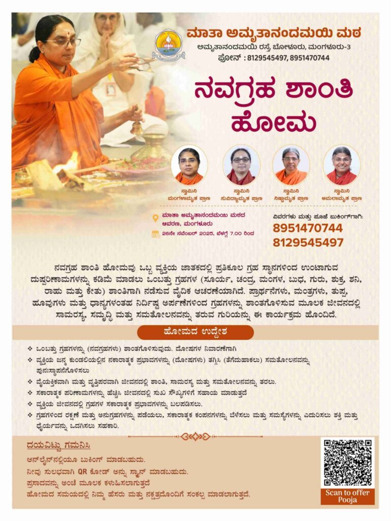 ಮಂಗಳೂರು ಬೋಳೂರಿನಲ್ಲಿರುವ ಮಾತಾ ಅಮೃತಾನಂದಮಯಿ ಮಠದ ವತಿಯಿಂದ ನವೆಂಬರ್ 26ರಂದು ನವಗ್ರಹ ಶಾಂತಿ ಹೋಮವು ಮಠದ ಆವರಣದಲ್ಲಿ ಬೆಳಿಗ್ಗೆ7 ಗಂಟೆಗೆ ನಡೆಯಲಿದೆ.