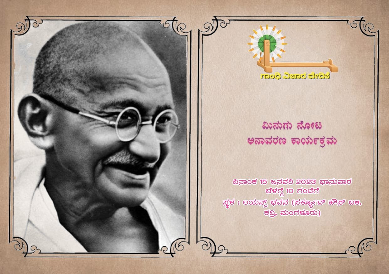 ಗಾಂಧಿ ವಿಚಾರ ವೇದಿಕೆ ವತಿಯಿಂದ ಮಿನುಗು ನೋಟ ಎಮ್.ಜಿ. ಹೆಗ್ಡೆಯವರು ಬರೆದಿರುವ ಗಾಂಧೀಜಿಯವರ ಕುರಿತ ಪ್ರಶ್ನೆಗಳಿಗೆ ಉತ್ತರದ ಪುಸ್ತಕ ಬಿಡುಗಡೆ ಕಾರ್ಯಕ್ರಮವು ಜನವರಿ 15ರಂದು ಬೆಳಿಗ್ಗೆ 10 ಗಂಟೆಗೆ ನಗರದ ಕದ್ರಿಯಲ್ಲಿರುವ ಲಯನ್ಸ್ ಭವನದಲ್ಲಿ ನಡೆಯಲಿದೆ.
