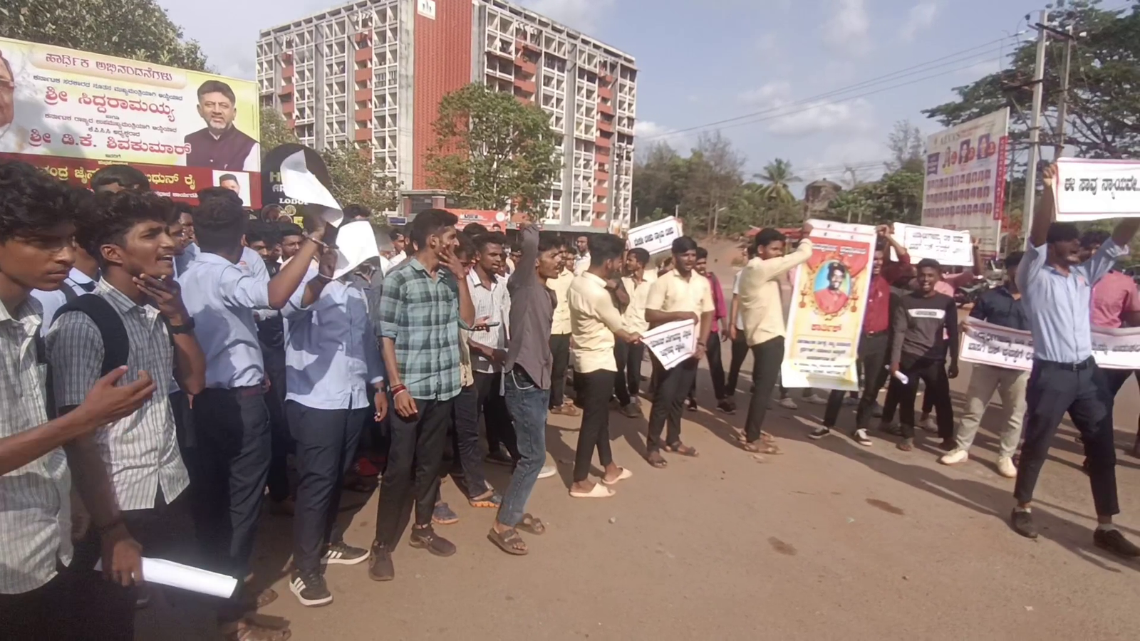 ಮೂಡುಬಿದಿರೆ: ಖಾಸಗಿ ಬಸ್ ಬೈಕ್ಗೆ ಢಿಕ್ಕಿ ಹೊಡೆದು ವಿದ್ಯಾರ್ಥಿ ಕಾರ್ತಿಕ್ ಆಚಾರ್ಯ ಮೃತಪಟ್ಟಿದ್ದು, ಚಾಲಕನ ನಿರ್ಲಕ್ಷ್ಯತನವನ್ನು ಖಂಡಿಸಿ ಮೂಡುಬಿದಿರೆಯ ವಿವಿಧ ಕಾಲೇಜುಗಳ ವಿದ್ಯಾರ್ಥಿಗಳು ವಿದ್ಯಾಗಿರಿ ಜಂಕ್ಷನ್ನಲ್ಲಿ ಪ್ರತಿಭಟನೆ ನಡೆಸಿದರು.