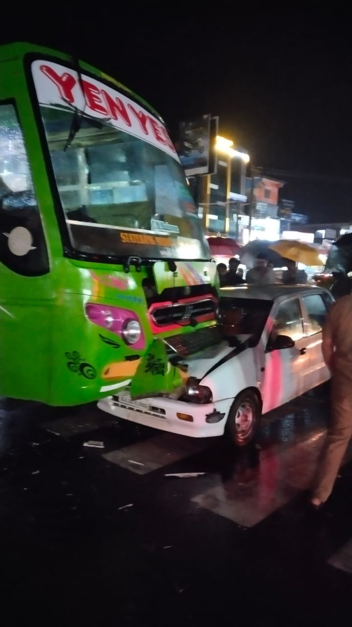 ಮಂಗಳೂರಿನಿಂದ ಬಿ.ಸಿ ರೋಡಿನತ್ತ ತೆರಳುತ್ತಿದ್ದ ಎನ್.ಎಸ್ ಟ್ರಾವೆಲ್ಸ್ ಬಸ್ಸು ಮುಡಿಪು ಜಂಕ್ಷನ್ನಿನಲ್ಲಿ ತಿರುಗುವ ಸಂದರ್ಭ , ಭಾರತಿ ಶಾಲೆ ಕಡೆಯಿಂದ ಬರುತ್ತಿದ್ದ ಝೆನ್ ಕಾರಿಗೆ ಮುಖಾಮುಖಿ ಢಿಕ್ಕಿ ಹೊಡೆದಿದೆ. ಬಸ್ಸು ಮುಂಭಾಗಕ್ಕೆ ಕಾರು ಒಳನುಗ್ಗಿದ್ದು, ಕಾರು ಚಾಲಕ ಪವಾಡಸದೃಶ ರೀತಿಯಲ್ಲಿ ಪಾರಾಗಿದ್ದಾರೆ. ಮಂಗಳೂರು ದಕ್ಷಿಣ ಸಂಚಾರಿ ಠಾಣಾ ಪೆÇಲೀಸರು ಸ್ಥಳಕ್ಕಾಗಮಿಸಿ ಪರಿಶೀಲನೆ ನಡೆಸಿದ್ದಾರೆ.