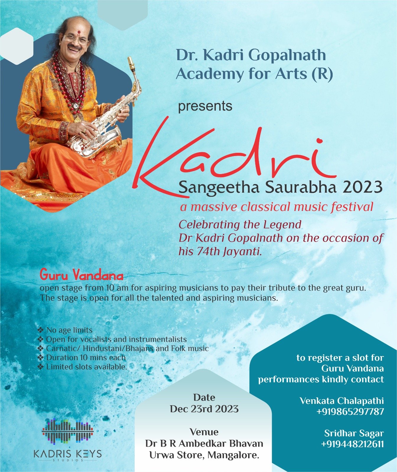ಅಂತರಾಷ್ಟ್ರೀಯ ಖ್ಯಾತಿಯ ಸ್ಯಾಕ್ಸೋಫೋನ್ ಕಲಾವಿದರಾದ ಪದ್ಮಶ್ರೀ ಪುರಸ್ಕೃತ ಡಾ.ಕದ್ರಿ ಗೋಪಾಲನಾಥ್ ರವರ ಹೆಸರಿನಲ್ಲಿ ನಡೆಯುತ್ತಿರುವ “ಡಾ. ಕದ್ರಿ ಗೋಪಾಲನಾಥ್ ಅಕಾಡೆಮಿ ಫಾರ್ ಆರ್ಟ್ಸ್ (ರಿ)” ವತಿಯಿಂದ ದಿನಾಂಕ : 23.12.2023 ರಂದು ” ಕದ್ರಿ ಸಂಗೀತ ಸೌರಭ 2023″ ಕಾರ್ಯಕ್ರಮವನ್ನು ಡಾ. ಬಿ.ಆರ್. ಅಂಬೇಡ್ಕರ್ ಭವನ, ಉರ್ವ ಸ್ಟೋರ್ಸ್, ಮಂಗಳೂರು ಇಲ್ಲಿ ಆಯೋಜನೆ ಮಾಡಲಾಗಿದೆ.