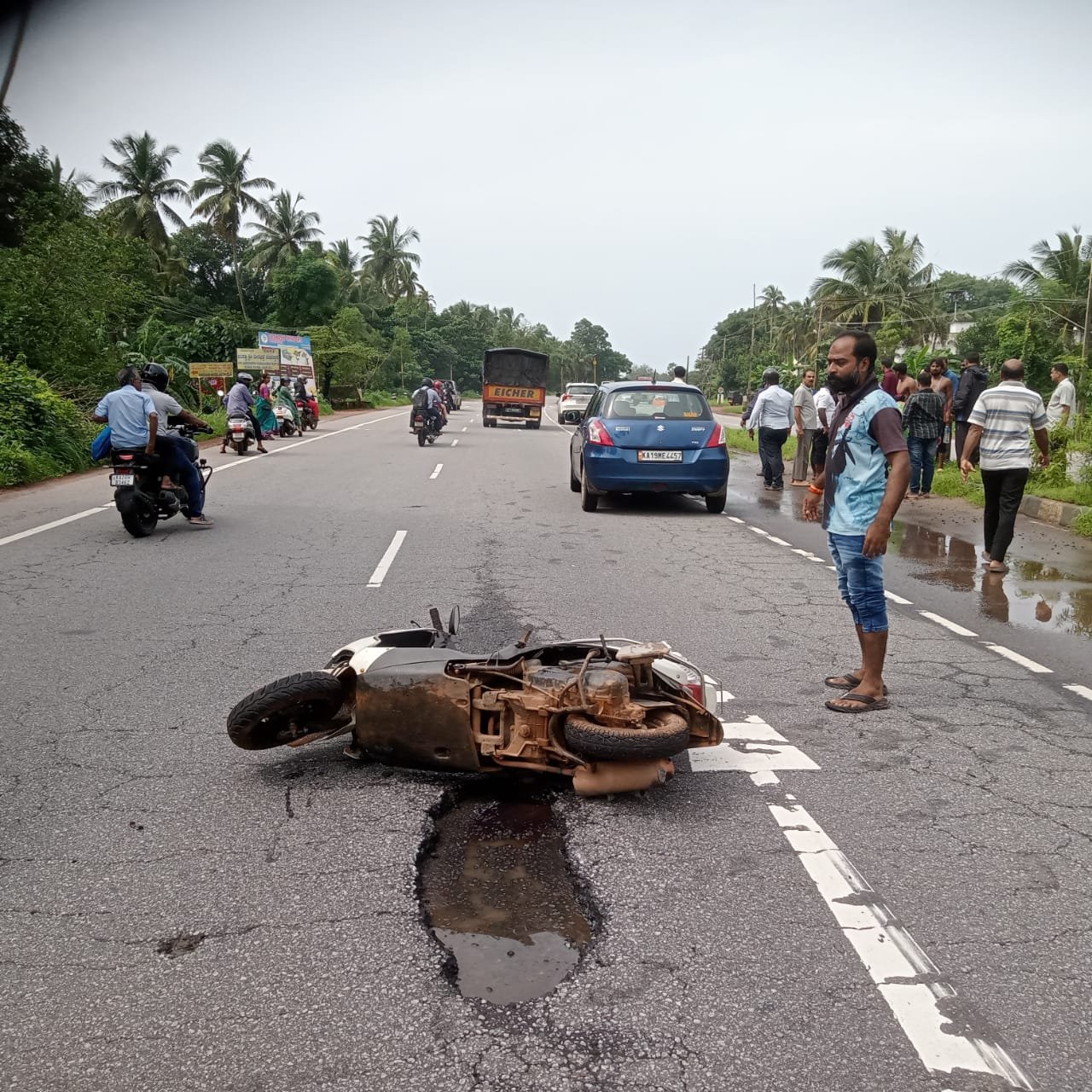 ಅದಮಾರು ಕಡೆಯಿಂದ ಹೆದ್ದಾರಿಗೆ ಬಂದ ಸ್ಕೂಟರ್ ಮಂಗಳೂರು ಕಡೆಗೆ ಹೋಗುತ್ತಿದ್ದ ವೇಳೆ, ಅದೇ ಉಡುಪಿ ಕಡೆಯಿಂದ ಮಂಗಳೂರು ಕಡೆಗೆ ಹೋಗುತ್ತಿದ್ದ ಮಹೇಂದ್ರ ಕಾರಿನ ಚಾಲಕ ಹೆದ್ದಾರಿಯ ಹೊಂಡ ತಪ್ಪಿಸಲು ಯಾವುದೇ ಸೂಚನೆ ನೀಡದೆ ತಿರುಗಿಸಿದ್ದರ ಪರಿಣಾಮ ಸ್ಕೂಟರ್ ಗೆ ಡಿಕ್ಕಿಯಾಗಿದ್ದು, ಅಪಘಾತದ ತೀವ್ರತೆಗೆ ಎಸೆಯಲ್ಪಟ್ಟಿದ್ದ ಸ್ಕೂಟರ್ ಸವಾರ ಅದೇ ಕಡೆಯಿಂದ ಬರುತ್ತಿದ್ದ ಮಾರುತಿ ಕಾರಿಗೆ ಡಿಕ್ಕಿಯಾಗಿದ್ದ, ಮಾರುತಿ ಕಾರಿನ ಚಾಲಕನ ಸಮಯ ಪ್ರಜ್ಞೆಯಿಂದ ಸ್ಕೂಟರ್ ಸವಾರ ಪ್ರಾಣಾಪಾಯದಿಂದ ಪಾರಾಗುವಂತ್ತಾಗಿದೆ ಎಂಬುದಾಗಿ ಪ್ರತ್ಯಕ್ಷದರ್ಶಿಗಳು ತಿಳಿಸಿದ್ದು, ಈ ಅಪಘಾತಕ್ಕೆ ಹೊಂಡಮಯ ಹೆದ್ದಾರಿ ಕಾರಣ ಎಂಬುದಾಗಿ ಆಕ್ರೋಶ ವ್ಯಕ್ತ ಪಡಿಸಿದ್ದಾರೆ.