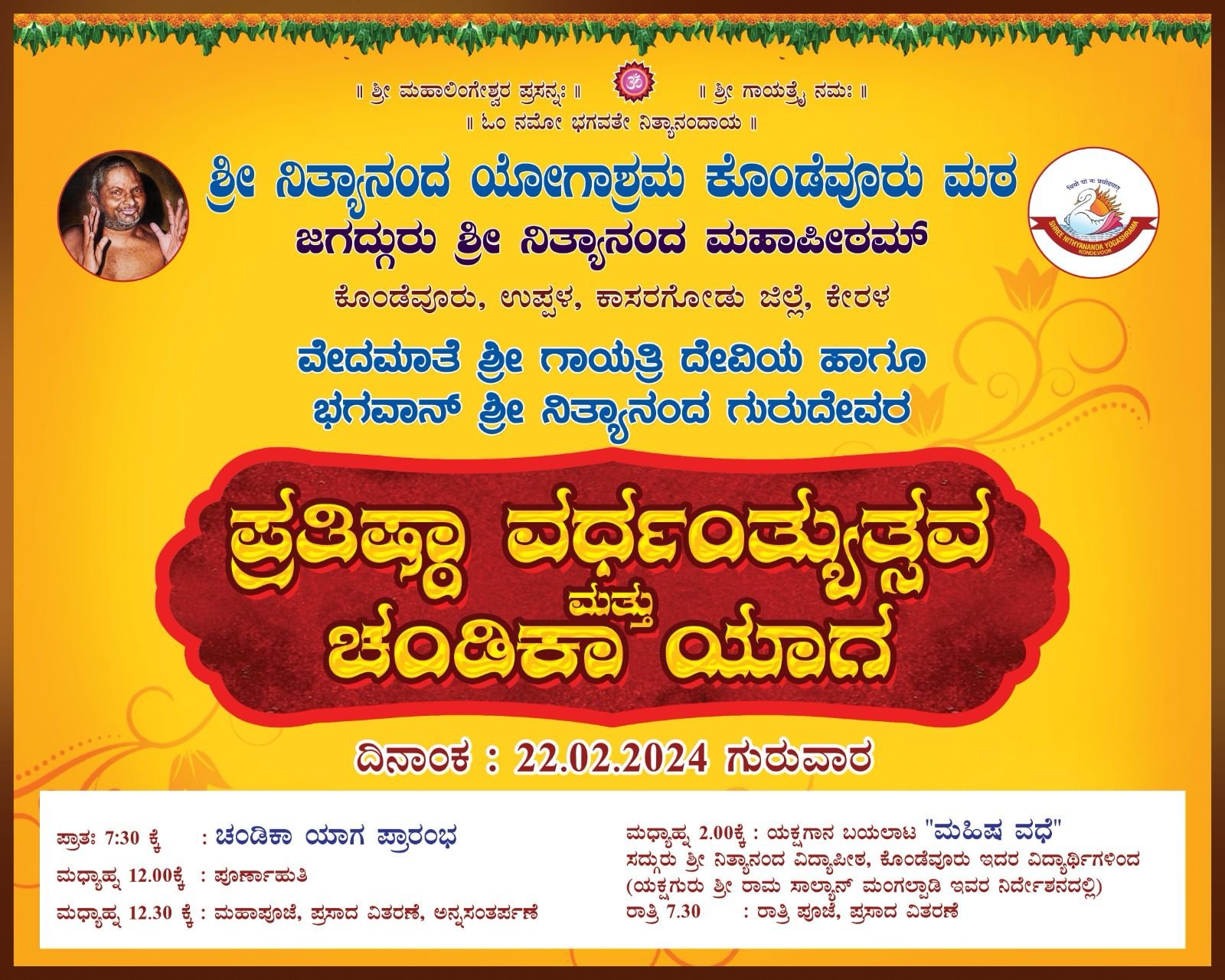 ಶ್ರೀ ನಿತ್ಯಾನಂದ ಯೋಗಾಶ್ರಮ ಕೊಂಡೆವೂರು ಮಠದ ಶ್ರೀ ಗಾಯತ್ರೀ ದೇವಿ ಹಾಗೂ ಭಗವಾನ್ ನಿತ್ಯಾನಂದ ಗುರುದೇವರ ಪ್ರತಿಷ್ಠಾ ವರ್ಧಂತಿ ಕಾರ್ಯಕ್ರಮವು ಕೊಂಡೆವೂರು ಮಠದ ಶ್ರೀ ಶ್ರೀ ಯೋಗಾನಂದ ಸರಸ್ವತೀ ಸ್ವಾಮೀಜಿಯವರ ದಿವ್ಯ ಉಪಸ್ಥಿತಿಯಲ್ಲಿ, ಶ್ರೀಕ್ಷೇತ್ರ ಕಟೀಲಿನ ಅನುವಂಶಿಕ ಪ್ರಧಾನ ಅರ್ಚಕರಾದ ಬ್ರಹ್ಮಶ್ರೀ ಕಮಲಾದೇವೀ ಪ್ರಸಾದ ಆಸ್ರಣ್ಣರವರ ಆಚಾರ್ಯತ್ವದಲ್ಲಿ ದಿ. 22.02.2024 ಗುರುವಾರದಂದು, ಚಂಡಿಕಾ ಹೋಮ ಸಹಿತ ವಿವಿಧ ಧಾರ್ಮಿಕ ಕಾರ್ಯಕ್ರಮಗಳೊಂದಿಗೆ ನಡೆಯಲಿದೆ.