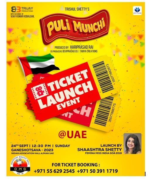ಬಹು ನಿರೀಕ್ಷೆಯ ಪುಳಿಮುಂಚಿ ತುಳು ಚಿತ್ರದ ಪ್ರೀಮಿಯರ್ ಪ್ರದರ್ಶನದ ಟಿಕೆಟ್ ಬಿಡುಗಡೆ ಕಾರ್ಯಕ್ರಮವು ಯುಎಇಯ ಅಜ್ಮಾನ್ ನ ಇಂಡಿಯನ್ ಅಸೋಸಿಯೇಷನ್ ಸಭಾಂಗಣದಲ್ಲಿ ಸಪ್ಟೆಂಬರ್ 24 ರಂದು ಜರಗಲಿದೆ.