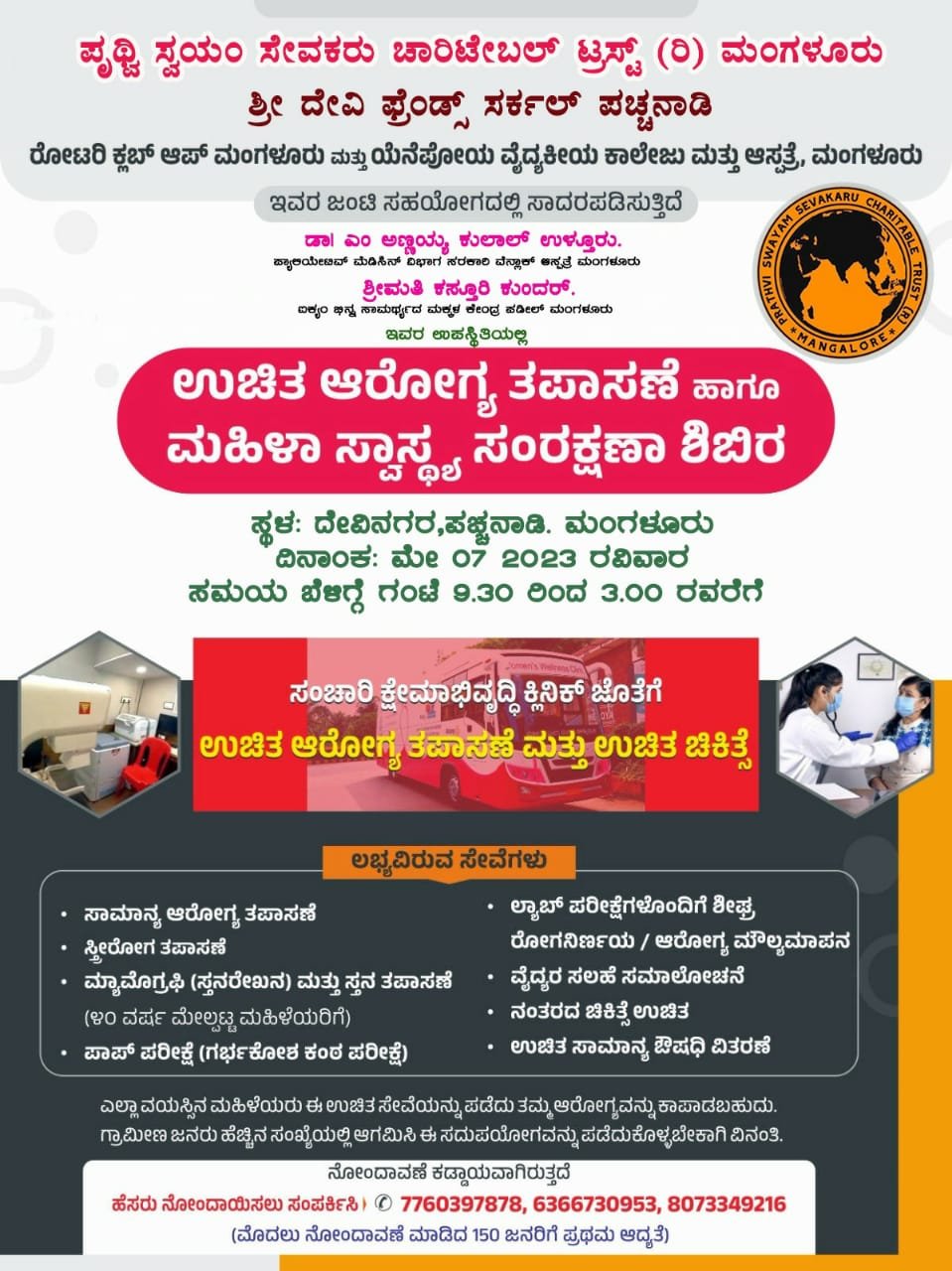 ಶ್ರೀ ದೇವಿ ಫ್ರೆಂಡ್ಸ್ ಸರ್ಕಲ್ (ರಿ) ಪಚ್ಚನಾಡಿ , ಪೃಥ್ವಿ ಸ್ವಯಂ ಸೇವಕರು ಚಾರಿಟೇಬಲ್ ಟ್ರಸ್ಟ್ (ರಿ) ಮಂಗಳೂರು , ಶ್ರೀ ದೇವಿ ಮಾತೃ ಮಂಡಳಿ ಪಚ್ಚನಾಡಿ ವತಿಯಿಂದ ರೋಟರಿ ಕ್ಲಬ್ ಆಫ್ ಮಂಗಳೂರು ಮತ್ತು ಯೇನಪೊಯಾ ವೈದ್ಯಕೀಯ ಕಾಲೇಜು ಮತ್ತು ಆಸ್ಪತ್ರೆ ಸಹಕಾರದಲ್ಲಿ ಮಹಿಳೆಯರ ಎಲ್ಲಾ ವಿಧದ ಕ್ಯಾನ್ಸರ್ ತಪಾಸಣೆ ಹಾಗೂ ಉಚಿತ ಚಿಕಿತ್ಸಾ ಶಿಬಿರಇದೇ ಬರುವ ದಿನಾಂಕ 07-05-2023 ರ ಆದಿತ್ಯವಾರ ಬೆಳಿಗ್ಗೆ 9.30 ಗಂಟೆಗೆ ಸರಿಯಾಗಿ ಪಚ್ಚನಾಡಿ ದೇವಿನಗರದ ಶ್ರೀ ದೇವಿ ಫ್ರೆಂಡ್ಸ್ ಸರ್ಕಲ್ ವೇದಿಕೆಯಲ್ಲಿ ಮಂಗಳೂರಿನ ಹೆಸರಾಂತ ಆಸ್ಪತ್ರೆಯಾದ ಯೇನಪೋಯ ಆಸ್ಪತ್ರೆಯ ವಿಶೇಷ ತಂತ್ರಜ್ಞಾನದ ಶುಶ್ರೂಷೆಯ ಆಧುನಿಕ ಉಪಕರಣಗಳಿರುವ ವಾಹನಗಳೊಂದಿಗೆ ತಜ್ಞ ವೈದ್ಯರ ತಂಡದಿಂದ ಮಹಿಳೆಯರಿಗಾಗಿ ಮಹಿಳೆಯರ ಎಲ್ಲಾ ವಿಧದ ಕ್ಯಾನ್ಸರ್ ತಪಾಸಣೆ ಅಲ್ಲದೆ ಅನೇಕ ಸ್ತ್ರೀ ರೋಗ ತಪಾಸಣೆಯು ಉಚಿತವಾಗಿ ನಡೆಯಲಿದೆ.
