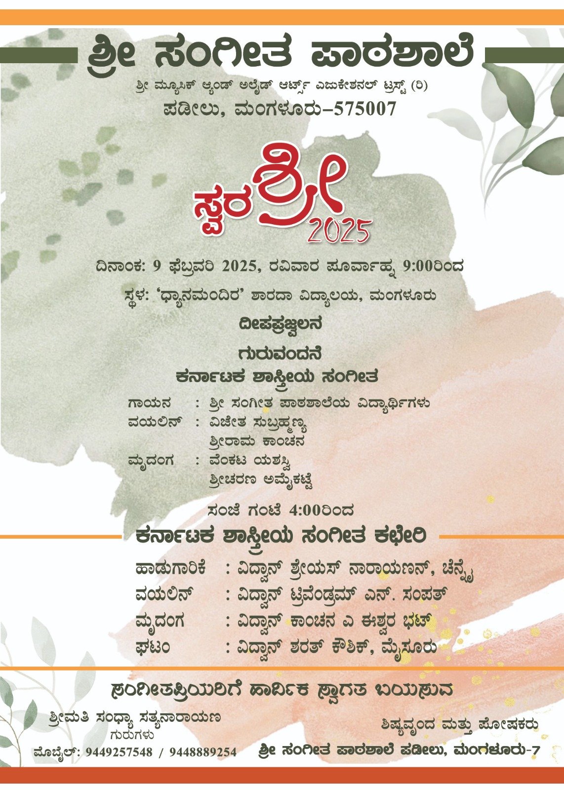 ಮಂಗಳೂರಿನ ಶ್ರೀ ಸಂಗೀತ ಪಾಠಶಾಲೆಯ ವಾರ್ಷಿಕೋತ್ಸವ `ಸ್ವರಶ್ರೀ 2025′ ಮಂಗಳೂರಿನ ಶಾರದಾ ವಿದ್ಯಾಲಯದ ಧ್ಯಾನಮಂದಿರದಲ್ಲಿ ಫೆಬ್ರವರಿ 9ರಂದು ನಡೆಯಲಿದೆ. ಪೂರ್ವಾಹ್ನ ಗಂಟೆ 9ರಿಂದ ಸಂಜೆ 4ರ ವರೆಗೆ ನಿರಂತರ ಸಂಸ್ಥೆಯ ವಿದ್ಯಾರ್ಥಿಗಳು ಸಂಗೀತ ಕಾರ್ಯಕ್ರಮ ನಡೆಸಿಕೊಡಲಿದ್ದಾರೆ.