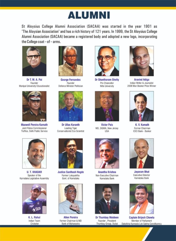 Sri K. S. Hegde, Former Speaker of the Lok Sabha; Dr T. M. A. Pai, Founder of the Manipal Group, Sri George Fernandes, eminent political leader; Sri Justice Santhosh Hegde, Former Lokayukta; Sri K. V. Kamath, BRICS Bank Chairman; Dr K. V. Rao, International Physicist; Sri K. K. Venugopal, the present Attorney General; Sri Aravind Adiga, Man Booker Prize winner; Sri Anant Agarwal, CEO of edX; Dr K. Ullas Karanth, leading Conservation Zoologist; K. L. Rahul, Cricketer; are a few personalities among many others who have made a mark in public life exemplify the calibre of Aloysians who have left an indelible mark on society. Alongside these luminaries, thousands of graduates occupy key roles as entrepreneurs, CEOs, scientists, academicians and artists across continents. Its sustained engagement ensures that the strong bond between alumni and their alma mater continues to grow, inspiring current students and reinforcing the global Aloysian identity.