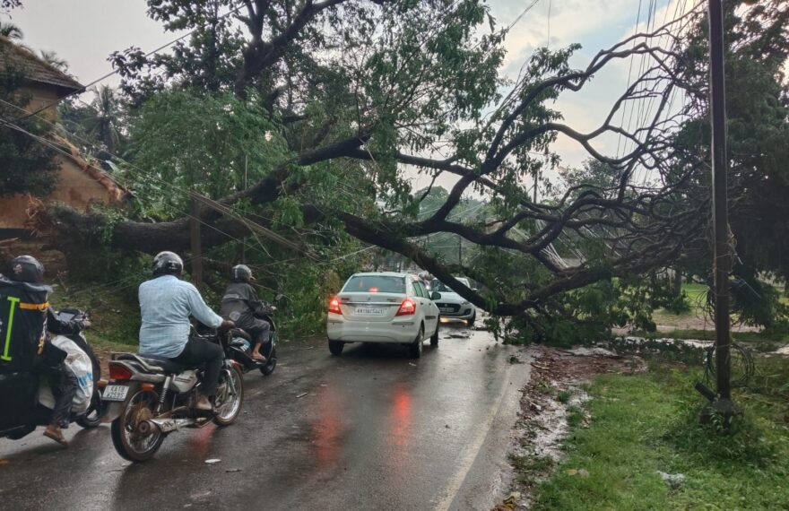 ಮೂಡುಬಿದಿರೆ : ತಾಲೂಕಿನಲ್ಲಿ ಶನಿವಾರ ಸಂಜೆ ಬೀಸಿದ ಗಾಳಿ ಮಳೆಗೆ ಸಮಾಜ ಮಂದಿರದ ಬಳಿ ಮರವೊಂದು ಸೀಯಾಳದ ಅಂಗಡಿ ಮೇಲೆ ಬಿದ್ದು ಜಖಂಗೊಂಡಿದೆ ಹಾಗೂ ಅಲ್ಲಿಯೇ ಪಕ್ಕದಲ್ಲಿರುವ ವಿದ್ಯುತ್ ಕಂಬವು ತುಂಡಾಗಿ ಫ್ಲೆಕ್ಸ್ ನ ಮೇಲೆ ಬಿದ್ದು ಸಿಲುಕಿಕೊಂಡಿರುವುದರಿಂದ ಸಂಭಾವ್ಯ ಅಪಾಯ ತಪ್ಪಿದ ಘಟನೆ ನಡೆದಿದೆ.ಆಲಂಗಾರು ಮತ್ತು ಉಳಿಯ ಪರಿಸರದಲ್ಲಿಯೂ ತೀವೃವಾದ ಗಾಳಿ ಬೀಸಿದ ಪರಿಣಾಮವಾಗಿ ಸಂತ ಥೋಮಸ್ ಹೈಸ್ಕೂಲ್ ನ ಮೇಲ್ಛಾವಣಿ ಹಾರಿ ಸುಮಾರು 100 ಮೀಟರ್ ದೂರದಲ್ಲಿ ಬಿದ್ದಿದ್ದು