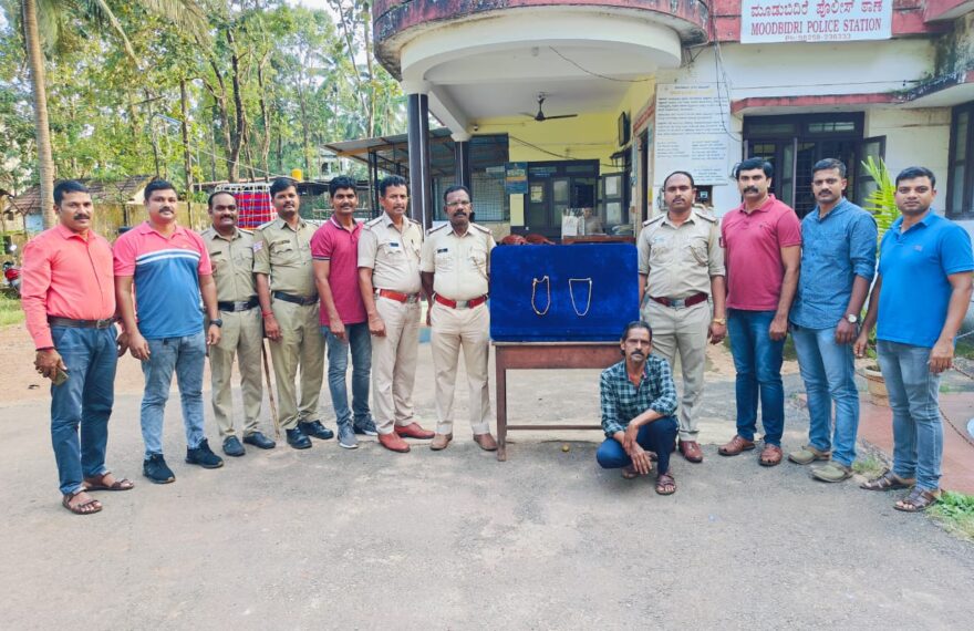 ಮೂಡುಬಿದಿರೆ: ಕಳೆದ ಮೂರು ತಿಂಗಳ ಹಿಂದೆ ಅಶ್ವತ್ಥಪುರದಲ್ಲಿರುವ ತನ್ನ ಮಗಳ ಮನೆಗೆ ಹೋಗಲೆಂದು ನಾರಾವಿಯಿಂದ ಬಂದಿದ್ದ ಮಹಿಳೆಯೋರ್ವರೊಂದಿಗೆ ಪರಿಚಿತನಂತೆ ನಟಿಸಿ ಆಕೆಯ ಕೈಯಿಂದ ಚಿನ್ನದ ಸರ ಕೊಂಡೊಯ್ದು ವಾಪಾಸು ಬಾರದೆ ತಪ್ಪಿಸಿಕೊಂಡಿದ್ದ ಕಳ್ಳನನ್ನು ಮೂಡುಬಿದಿರೆ ಇನ್ಸ್ಪೆಕ್ಟರ್ ಸಂದೇಶ್ ಪಿ.ಜಿ.ನೇತೃತ್ವ ಪೊಲೀಸರ ತಂಡವು ಬಂಧಿಸುವಲ್ಲಿ ಯಶಸ್ವಿಯಾಗಿದೆ.ಬಂಟ್ವಾಳ ತಾಲೂಕು ಕೆಂಪುಗುಡ್ಡೆಯ ಕಸವಿತ್ತಲ್ ಮನೆಯ ನಿವಾಸಿ ಸುರೇಶ ಯಾನೆ ಸಂತೋಷ ಬಂಧಿತ ಆರೋಪಿ. ನಾರಾವಿಯಿಂದ