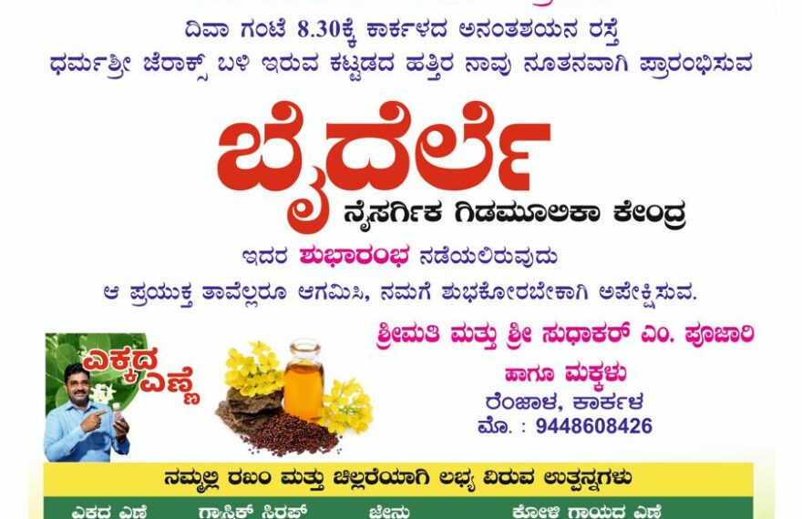 ಕಾರ್ಕಳದ ಅನಂತಶಯನ ರಸ್ತೆಯ ಧರ್ಮಶ್ರೀ ಜೆರಾಕ್ಸ್ ಬಳಿ ಇರುವ ಕಟ್ಟಡದ ಹತ್ತಿರ ಬೈದೆರ್ಲೆ ನೈಸರ್ಗಿಕ ಗಿಡಮೂಲಿಕಾ ಕೇಂದ್ರದ ಶುಭಾರಂಭವು ಜ.24ರಂದು ನಡೆಯಲಿದೆ. ಈ ಕಾರ್ಯಕ್ರಮಕ್ಕೆ ತಾವೆಲ್ಲರೂ ಆಗಮಿಸಿ, ಶುಭಕೋರುವಂತೆ ಶ್ರೀಮತಿ ಮತ್ತು ಶ್ರೀ ಸುಧಾಕರ್ ಎಂ. ಪೂಜಾರಿ ಹಾಗೂ ಮಕ್ಕಳು ರೆಂಜಾಳ ಕಾರ್ಕಳ ಅವರು ವಿನಂತಿಸಿಕೊಂಡಿದ್ದಾರೆ.