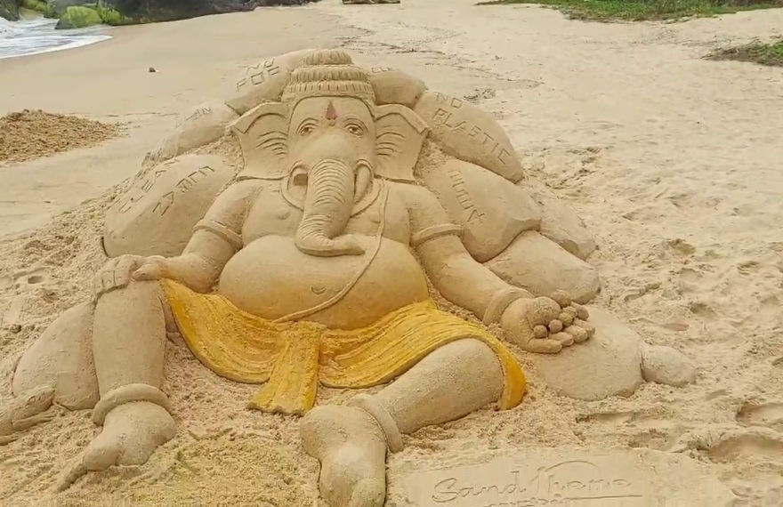 ಗಣೇಶ ಚತುರ್ಥಿಯನ್ನು ಎಲ್ಲೆಡೆ ಸಂಭ್ರಮದಿಂದ ಆಚರಣೆ ಮಾಡಲಾಗುತ್ತಿದೆ. ಉಡುಪಿಯ ಮರುಳ ಶಿಲ್ಪ ಕಲಾವಿದರು ಕಾಪು ಕಡಲ ಕಿನಾರೆಯಲ್ಲಿ ವಿಭಿನ್ನವಾಗಿ ಗಣಪತಿಯನ್ನು ಚಿತ್ರಿಸಿದ್ದಾರೆ. ಸ್ಯಾಂಡ್ ಥೀಂ ನ ಮೂರು ಜನ ಕಲಾವಿದರಾದ ಹರೀಶ್ ಸಾಗ, ಸಂತೋಷ್ ಭಟ್ ಹಾಲಾಡಿ, ಉಜ್ವಲ್ ಈ ಗಣಪತಿಯ ಬೃಹತ್ ಮರಳು ಶಿಲ್ಪವನ್ನು ರಚಿಸಿದ್ದಾರೆ. ಕಾಪು ಕಡಲ ಕಿನಾರೆಗೆ ಬಂದ ಪ್ರವಾಸಿಗರನ್ನು ಈ ಕಲಾಕೃತಿ ಸೆಳೆದಿದೆ. ಗಜಾನನ ಹೆಸರಿನ ಮರಳು ಶಿಲ್ಪ, ಪ್ಲಾಸ್ಟಿಕ್- ಪರಿಸರಕ್ಕೆ ಮಾರಕವಾದ
