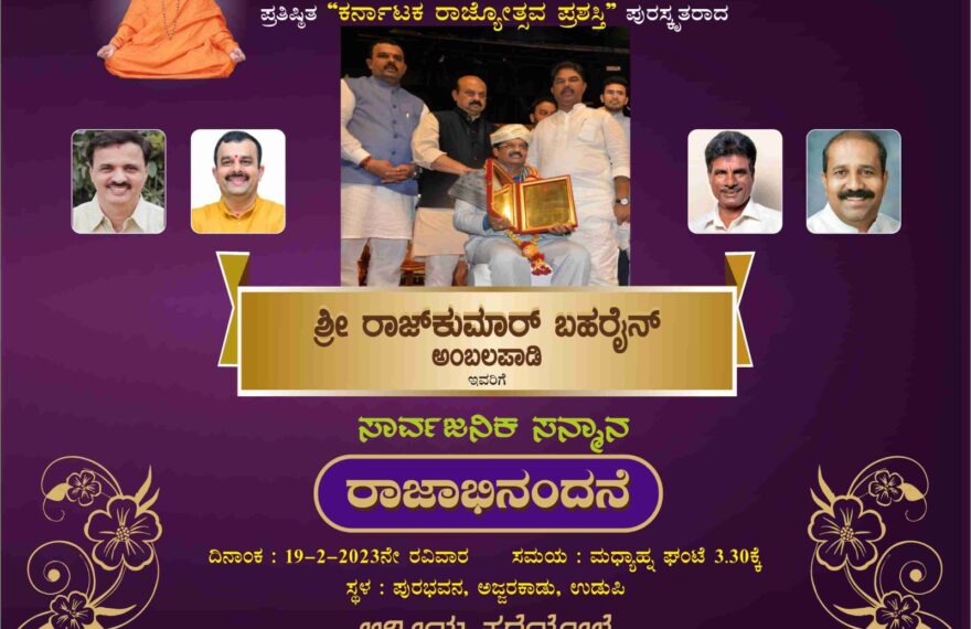ವಿದೇಶದಲ್ಲಿ ಕನ್ನಡ ಭಾಷೆ, ಕಲೆ, ಸಂಸ್ಕೃತಿಯನ್ನು ಪಸರಿಸಿ ಮೇಳೈಸಿದ ಅನಿವಾಸ ಭಾರತೀಯ ವಿಭಾಗದಲ್ಲಿ 2022ನೇ ಸಾಲಿನ ಪ್ರತಿಷ್ಠಿತ ಕರ್ನಾಟಕ ರಾಜ್ಯೋತ್ಸವ ಪ್ರಶಸ್ತಿ ಪುರಸ್ಕೃತರಾದ ರಾಜ್ ಕುಮಾರ್ ಬಹರೈನ್ ಅಂಬಲಪಾಡಿ ಇವರಿಗೆ ಸಾರ್ವಜನಿಕ ಸನ್ಮಾನ ಮತ್ತು ರಾಜಾಭಿನಂದನೆ ಕಾರ್ಯಕ್ರಮವು ಫೆ.19ರಂದು ಮಧ್ಯಾಹ್ನ 3.30ಕ್ಕೆ ಉಡುಪಿ ಅಜ್ಜರಕಾಡಿನ ಪುರಭವನದಲ್ಲಿ ನಡೆಯಲಿದೆ. ಕಾರ್ಯಕ್ರಮದಲ್ಲಿ ಧರ್ಮಸ್ಥಳದ ನಿತ್ಯಾನಂದ ನಗರದ ಶ್ರೀ ರಾಮ ಕ್ಷೇತ್ರ ಮಹಾ ಸಂಸ್ಥಾನಂ ಸದ್ಗುರು