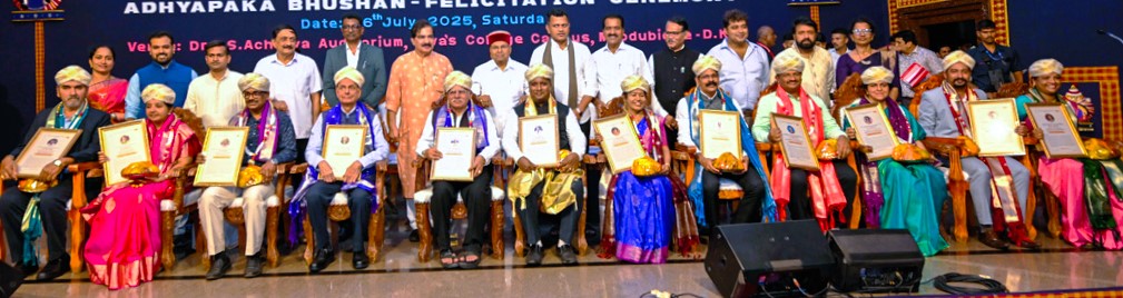 ಪ್ರಶಸ್ತಿ ಪ್ರದಾನ: ಜೀವಮಾನದ ಸಾಧನೆಗಾಗಿ ಮಣಿಪಾಲ್ ಅಕಾಡೆಮಿ ಆಫ್ ಹೈಯರ್ ಎಜುಕೇಶನ್ ಉಪಕುಲಪತಿ ಡಾ.ಎಚ್.ಎಸ್ ಬಲ್ಲಾಳ್ ಹಾಗೂ ಮೇಘಾಲಯದ ಸರಸ್ವತಿ ಸಮೂಹ ವಿದ್ಯಾಸಂಸ್ಥೆಗಳ ಸ್ಥಾಪಕ ಡಾ.ಅನಂತಕೃಷ್ಣ ಭಟ್ ಅವರಿಗೆ ಅಧ್ಯಾಪಕ ಭೂಷಣ ಪ್ರಶಸ್ತಿ ನೀಡಲಾಯಿತು. ಆಳ್ವಾಸ್ ಪದವಿ ಕಾಲೇಜಿನ ಪ್ರಾಂಶುಪಾಲ ಡಾ. ಕುರಿಯನ್ ಹಾಗೂ ಮಂಗಳೂರು ಕೆನರಾ ಕಾಲೇಜಿನ ಪ್ರಾಂಶುಪಾಲೆ ಡಾ.ಪ್ರೇಮಲತಾ (ಕಾಲೇಜು ಆಡಳಿತ ನಿರ್ವಹಣೆ ಪ್ರಶಸ್ತಿ), ಸ್ಕೂಲ್ ಆಫ್ ಎಕನಾಮಿಕ್ಸ್ ಮಣಿಪಾಲ್ನ ಪ್ರೊ. ಹರೀಶ್ ಜೋಶಿ, ಎ.ಜೆ ಇಂಜಿನಿಯರಿAಗ್ ಕಾಲೇಜಿನ ಪ್ರಾಂಶುಪಾಲ ಡಾ.ಶಾಂತರಾಮ ರೈ ಸಿ.(ಅತ್ಯುತ್ತಮ ಸಂಶೋಧಕ ಪ್ರಶಸ್ತಿ), ಮಂಗಳೂರು ವಿಶ್ವವಿದ್ಯಾನಿಲಯ ಕಾಲೇಜಿನ ಪ್ರಾಧ್ಯಾಪಕಿ ಡಾ.ಸುಭಾಷಿಣಿ ಶ್ರೀವತ್ಸ ಹಾಗೂ ಜಿ. ಶಂಕರ ಸರ್ಕಾರಿ ಪ್ರಥಮ ದರ್ಜೆ ಕಾಲೇಜಿನ ಪ್ರಾಧ್ಯಾಪಕ ಡಾ. ರಾಜೇಂದ್ರ(ಅತ್ಯುತ್ತಮ ಶಿಕ್ಷಕ ಪ್ರಶಸ್ತಿ), ಮಡಿಕೇರಿ ಫೀಲ್ಡ್ ಮಾರ್ಷಲ್ ಕೆ.ಎಂ ಕಾರ್ಯಪ್ಪ ಕಾಲೇಜಿನ ಪ್ರೊ. ವಿಜಯಲತಾ, ಕಾಪು ಸರ್ಕಾರಿ ಪ್ರಥಮ ದರ್ಜೆ ಕಾಲೇಜಿನ ಡಾ.ಯಶೋದ(ಅತ್ಯುತ್ತಮ ಗ್ರಂಥಪಾಲಕ ಪ್ರಶಸ್ತಿ), ಬೆಳ್ತಂಗಡಿ ಸರ್ಕಾರಿ ಪ್ರಥಮ ದರ್ಜೆ ಕಾಲೇಜಿನ ದೈಹಿಕ ಶಿಕ್ಷಣ ಶಿಕ್ಷಕ ಡಾ.ರಾಧಾಕೃಷ್ಣ ಹಾಗೂ ಕಾವೇರಿ ಕಾಲೇಜು ವಿರಾಜಪೇಟೆಯ ಶಿಕ್ಷಕ ತಮ್ಮಯ್ಯ ಅವರಿಗೆ ಅತ್ಯುತ್ತಮ ದೈಹಿಕ ಶಿಕ್ಷಣ ಶಿಕ್ಷಕರು ಪ್ರಶಸ್ತಿ ನೀಡಿ ಗೌರವಿಸಲಾಯಿತು. 2025ನೇ ಸಾಲಿನಲ್ಲಿ ಪಿ.ಎಚ್ಡಿ ಪದವಿ ಪಡೆದ 13 ಮಂದಿ ಸಂಶೋಧನಾರ್ಥಿಗಳನ್ನು ಸನ್ಮಾನಿಸಲಾಯಿತು.