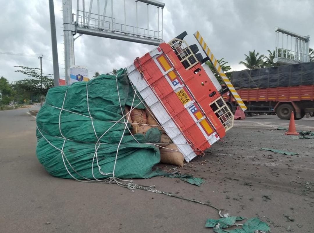 ಉಡುಪಿ ಜಿಲ್ಲೆ : ಮಂಗಳೂರಿನಿಂದ ಗೇರು ಬೀಜ ಹೇರಿಕೊಂಡ ಉಡುಪಿ ಕಡೆಗೆ ಸಂಚರಿಸುತ್ತಿದ್ದ ಲಾರಿಯೊಂದು ನಿಯಂತ್ರಣ ತಪ್ಪಿ ಪಲ್ಟಿಯಾದ ಘಟನೆ, ಇಂದು ಉಡುಪಿ ಸಮೀಪದ ಬಲಾಯಿಪಾದೆ ಜಂಕ್ಷನ್ ನ ರಾಷ್ಟ್ರೀಯ ಹೆದ್ದಾರಿ 66 ರಲ್ಲಿ ನಡೆಯಿತು. ಚಾಲಕನ ನಿಯಂತ್ರಣ ತಪ್ಪಿ ಲಾರಿ ಮಗುಚಿ ಬಿದ್ದಿದೆ ಎಂದು ತಿಳಿದು ಬಂದಿದೆ. ಲಾರಿ ಚಾಲಕನ ನಿಯಂತ್ರಣ ತಪ್ಪಿ ಲಾರಿ ಮಗುಚಿ ಬಿದ್ದಿದೆ ಎನ್ನಲಾಗಿದೆ. ಅದೃಷ್ಟವಶಾತ್ ಚಾಲಕ ಮತ್ತು ಕ್ಲೀನರ್ ಸಣ್ಣಪುಟ್ಟ ಗಾಯದೊಂದಿಗೆ ಅಪಾಯದಿಂದ ಪಾರಾಗಿದ್ದಾರೆ. ಆದರೆ ಲಾರಿ ಮುಂಭಾಗಕ್ಕೆ ಹಾನಿಯಾಗಿದ್ದು, ಪಲ್ಟಿಯಾದ ರಭಸಕ್ಕೆ ಅಪಾರ ಪ್ರಮಾಣದ ಗೇರುಬೀಜ ರಸ್ತೆಯಲ್ಲಿ ಚಲ್ಲಾಪಿಲ್ಲಿಯಾಗಿ ಬಿದ್ದಿವೆ.