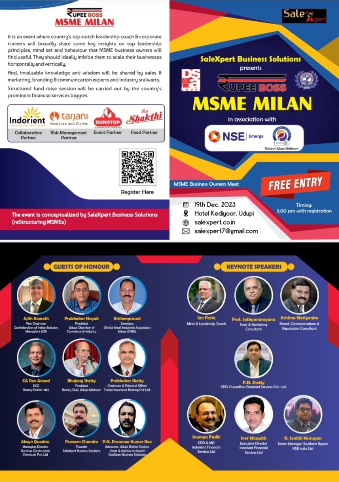 ಸೇಲ್ ಎಕ್ಸ್ಪರ್ಟ್ ಬ್ಯುಸಿನೆಸ್ ಸೊ ಲ್ಯೂಷನ್ಸ್ ವತಿಯಿಂದ ಎನ್ಎಸ್ಇ ಎಮರ್ಜ್, ಮತ್ತು ರೋಟರಿ ಉಡುಪಿ ಮಿಡ್ ಟೌನ್ ಸಹಯೋಗದೊಂದಿಗೆ ಎಮ್ಎಸ್ಎಮ್ಇ ಮಿಲನ್ ಡಿ.19ರಂದು ಉಡುಪಿಯ ಹೊಟೇಲ್ ಕಿದಿಯೂರಿನಲ್ಲಿ ಕಾರ್ಯಾಗಾರವನ್ನು ಹಮ್ಮಿಕೊಂಡಿದ್ದಾರೆ.