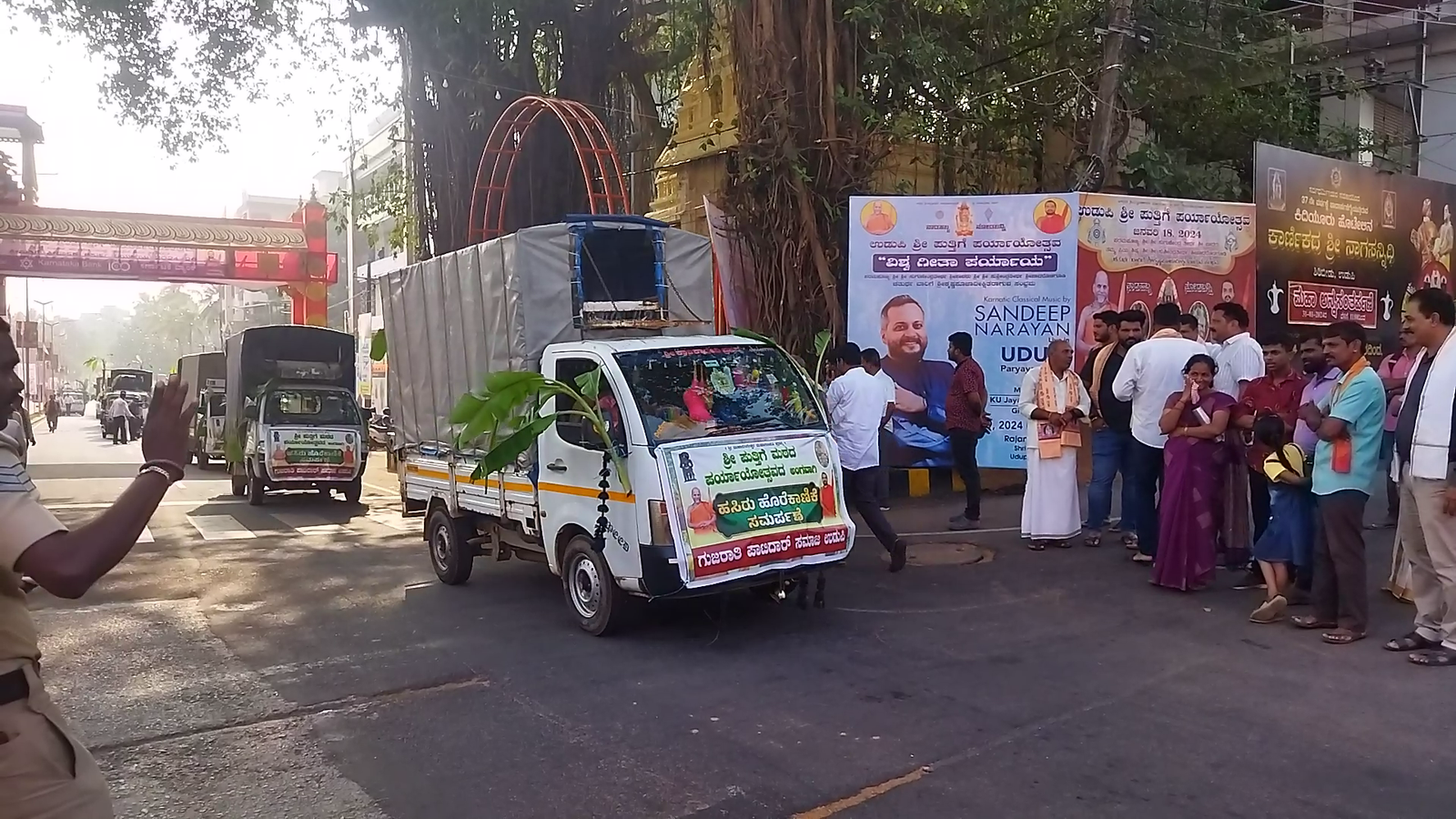 ಭಾರತೀಯ ಪರಂಪರೆ, ಮಾಧ್ವ ತತ್ವವನ್ನು ಜಗತ್ತಿಗೆ ಸಾರಿದ ಹಾಗೂ ಗೀತಾಸಾರವನ್ನು ವಿಶ್ವಕ್ಕೆ ಪಸರಿಸಲು ಕಾರಣವಾಗಿರುವ ಉಡುಪಿ ಅಷ್ಠಮಠಗಳ ಪೈಕಿ ಪುತ್ತಿಗೆ ಮಠದ ಶ್ರೀ ಸುಗುಣೇಂದ್ರ ತೀರ್ಥ ಸ್ವಾಮೀಯವರ ಪರ್ಯಾಯ ಪೀಠಾರೋಹಣ ಕಾರ್ಯಕ್ರಮಕ್ಕೆ ಕ್ಷಣಗಣನೆ ಆರಂಭವಾಗಿದ್ದು, ಇಂದು ಹೊರೆಕಾಣಿಕೆ ಮೆರವಣಿಗೆ ನಡೆಯಿತು. ವಿವಿಧೆಡೆಗಳಿಂದ ಆಗಮಿಸಿದ್ದ ಹೊರೆಕಾಣಿಕೆಯನ್ನು ಮೆರವಣಿಗೆಯ ಮೂಲಕ ಮಠಕ್ಕೆ ಅಗಮಿಸಿತ್ತು. ಈ ಸಂದರ್ಭ ಸಾವಿರಾರು ಭಕ್ತರು ಪಾಲ್ಗೊಂಡಿದ್ದರು.