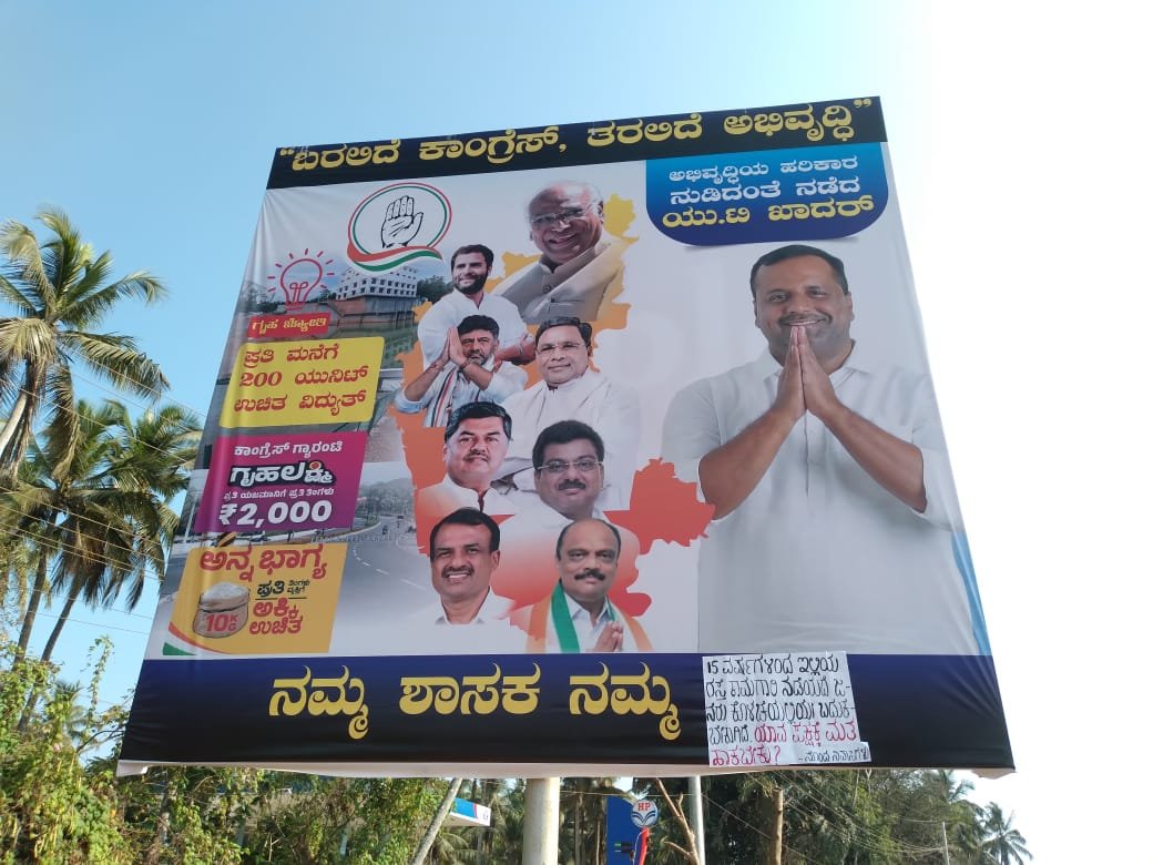 ಉಳ್ಳಾಲ: ಕಾಂಗ್ರೆಸ್ ಚುನಾವಣಾ ಪ್ರಚಾರವಾಗಿ ಸೋಮೇಶ್ವರ ಕೊಲ್ಯ ಸಮೀಪ ಹಾಕಲಾದ ಬ್ಯಾನರಿಗೆ ಗ್ರಾಮಸ್ಥರು ಸ್ಟಿಕ್ಕರ್ ಅಂಟಿಸಿ 15 ವರ್ಷಗಳಿಂದ ಹದಗೆಟ್ಟಿರುವ ರಸ್ತೆ ನಿರ್ಮಾಣಕ್ಕೆ ಒತ್ತಾಯಿಸಿದ್ದಾರೆ.