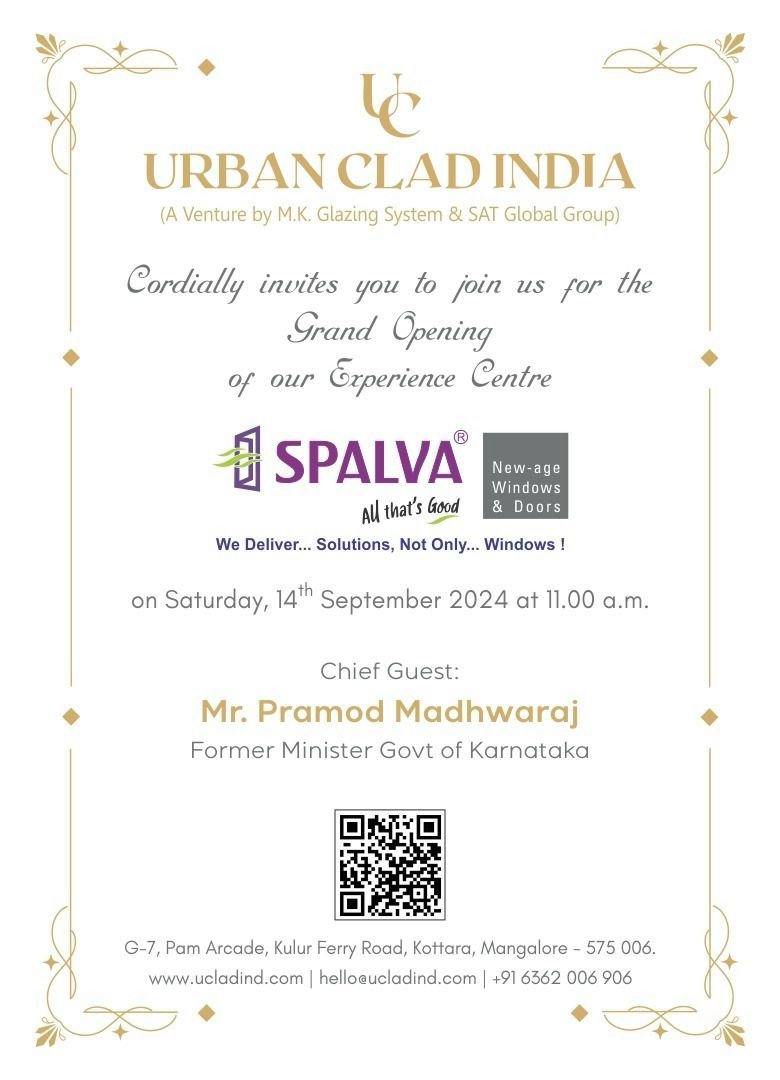 ಎಂ.ಕೆ ಗ್ಲಾಜಿಂಗ್ ಸಿಸ್ಟಮ್ ಮತ್ತು ಎಸ್ಎಟಿ ಗ್ಲೋಬಲ್ ಗ್ರೂಪ್ ವೆಂಚರ್ನ ಅರ್ಬನ್ ಕ್ಲಾಡ್ ಇಂಡಿಯಾದ ವತಿಯಿಂದ ನೂತನ ಭವ್ಯವಾದ ಎಕ್ಸ್ಪೀರಿಯನ್ಸ್ ಸೆಂಟರ್ ಸ್ಪಲ್ವಾ ಇದರ ಉದ್ಘಾಟನಾ ಕಾರ್ಯಕ್ರಮವು ಸೆ.14ರಂದು ನಡೆಯಲಿದೆ.